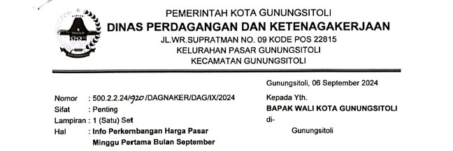 Info DagnakerPerangkat Daerah Perkembangan Harga Pasar Minggu Pertama Bulan September By Dinas Komunikasi dan Informatika - September 7, 2024 56 0 FacebookTwitterWhatsAppPinterestTelegramPrint info pasar minggu pertama bulan September 2024Unduh RELATED ARTICLESMORE FROM AUTHOR Info Setwan AKSI DAMAI PERCEPATAN PEMBENTUKAN PROVINSI KEPULAUAN NIAS DIGELAR DI DPRD KOTA GUNUNGSITOLI TAHUN 2025 Info Setwan Profil Pimpinan DPRD Periode Tahun 2024-2029 Kota Gunungsitoli Dokumen Siap Cetak Dokumen Kependudukan dan Pencatatan Sipil Siap Cetak per Tanggal 6 Oktober 2025 LEAVE A REPLY Cancel reply Please enter your comment! Please enter your name here You have entered an incorrect email address! Please enter your email address here Save my name, email, and website in this browser for the next time I comment. Δ