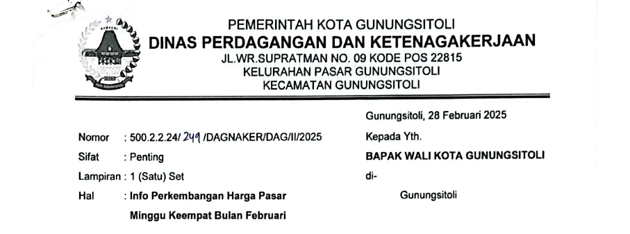 Info DagnakerPerangkat Daerah Perkembangan Harga Pasar Minggu Keempat Bulan Februari By Dinas Komunikasi dan Informatika - February 28, 2025 75 0 FacebookTwitterWhatsAppPinterestTelegramPrint MINGGU KEEMPAT FEBRUARI 2025Unduh RELATED ARTICLESMORE FROM AUTHOR Info Setwan AKSI DAMAI PERCEPATAN PEMBENTUKAN PROVINSI KEPULAUAN NIAS DIGELAR DI DPRD KOTA GUNUNGSITOLI TAHUN 2025 Info Setwan Profil Pimpinan DPRD Periode Tahun 2024-2029 Kota Gunungsitoli Dokumen Siap Cetak Dokumen Kependudukan dan Pencatatan Sipil Siap Cetak per Tanggal 6 Oktober 2025 LEAVE A REPLY Cancel reply Please enter your comment! Please enter your name here You have entered an incorrect email address! Please enter your email address here Save my name, email, and website in this browser for the next time I comment. Δ