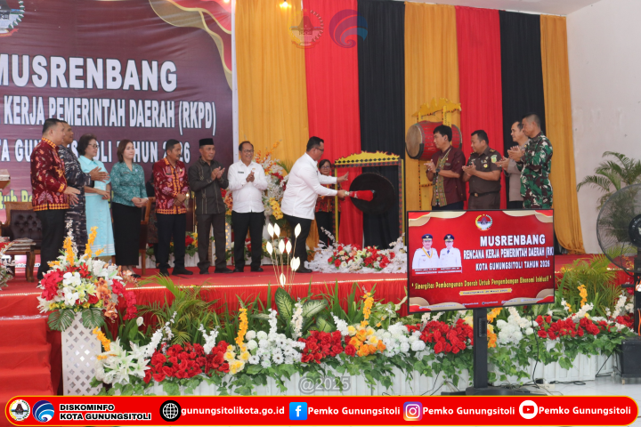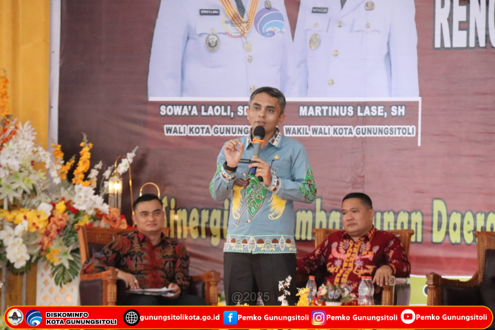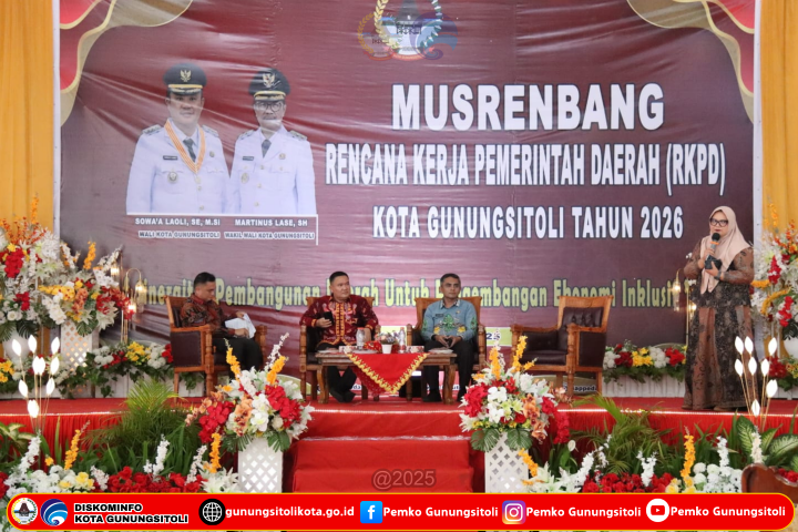 Gunungsitoli (20/03/2025), Pemerintah Kota Gunungsitoli melaksanakan agenda Musyawarah Perencanaan Pembangunan (Musrenbang) dalam rangka penyusunan Rencana Kerja Pemerintah Daerah (RKPD) Kota Gunungsitoli Tahun 2026. Adapun Tema yang telah dirumuskan adalah “SINERGITAS PEMBANGUNAN DAERAH UNTUK PENGEMBANGAN EKONOMI INKLUSIF”. Musrenbang dibuka secara resmi oleh Wali Kota Gunungsitoli Sowa’a Laoli, S.E., M.Si yang ditandai dengan pemukulan gong, bertempat di Gedung Serba Guna ST Yacobus Laverna Gunungsitoli, Kamis (20/03/2025).