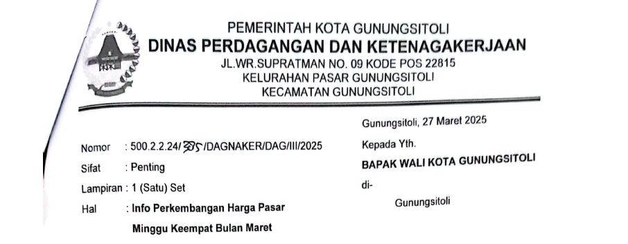 Info DagnakerPerangkat Daerah Perkembangan Harga Pasar Minggu Keempat Bulan Maret By Dinas Komunikasi dan Informatika - March 28, 2025 62 0 FacebookTwitterWhatsAppPinterestTelegramPrint Info Perkembangan Harga Pasar Minggu keempat bulan Maret 2025Unduh RELATED ARTICLESMORE FROM AUTHOR Info Setwan AKSI DAMAI PERCEPATAN PEMBENTUKAN PROVINSI KEPULAUAN NIAS DIGELAR DI DPRD KOTA GUNUNGSITOLI TAHUN 2025 Info Setwan Profil Pimpinan DPRD Periode Tahun 2024-2029 Kota Gunungsitoli Dokumen Siap Cetak Dokumen Kependudukan dan Pencatatan Sipil Siap Cetak per Tanggal 6 Oktober 2025 LEAVE A REPLY Cancel reply Please enter your comment! Please enter your name here You have entered an incorrect email address! Please enter your email address here Save my name, email, and website in this browser for the next time I comment. Δ