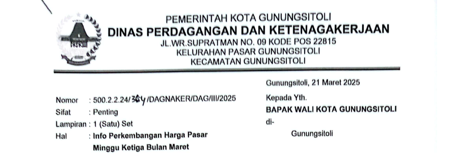 Info DagnakerPerangkat Daerah Perkembangan Harga Pasar Minggu Ketiga Bulan Maret By Dinas Komunikasi dan Informatika - March 22, 2025 56 0 FacebookTwitterWhatsAppPinterestTelegramPrint Info Perkembangan Harga Pasar Minggu ketiga bulan Maret 2025Unduh RELATED ARTICLESMORE FROM AUTHOR Info Setwan AKSI DAMAI PERCEPATAN PEMBENTUKAN PROVINSI KEPULAUAN NIAS DIGELAR DI DPRD KOTA GUNUNGSITOLI TAHUN 2025 Info Setwan Profil Pimpinan DPRD Periode Tahun 2024-2029 Kota Gunungsitoli Dokumen Siap Cetak Dokumen Kependudukan dan Pencatatan Sipil Siap Cetak per Tanggal 6 Oktober 2025 LEAVE A REPLY Cancel reply Please enter your comment! Please enter your name here You have entered an incorrect email address! Please enter your email address here Save my name, email, and website in this browser for the next time I comment. Δ