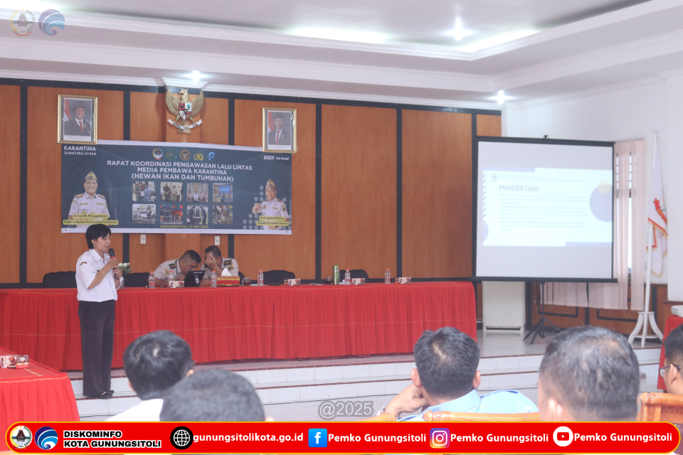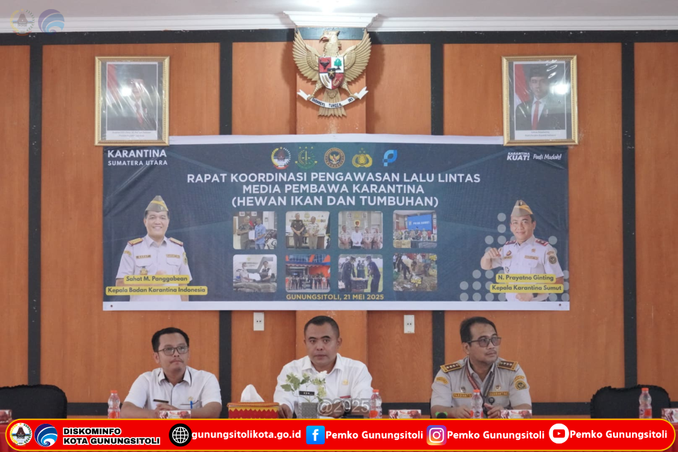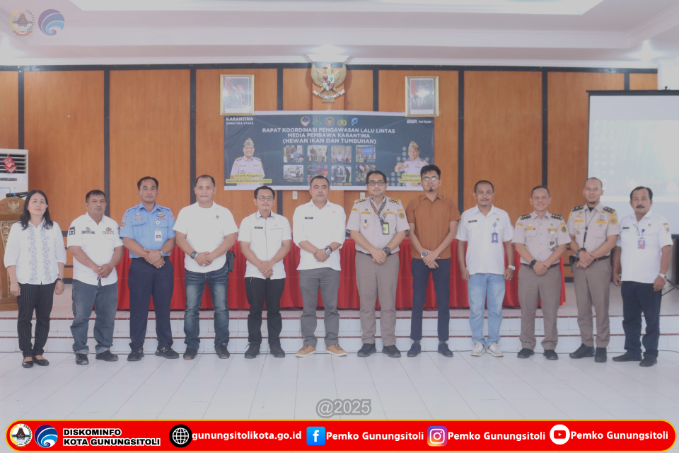 Gunungsitoli (21/05/2025) Wali Kota Gunungsitoli yang diwakili oleh Asisten Sekda Bidang Perekonomian dan Pembangunan Eko Ary Yanto Tello Zebua, S. Kom., M. Si menghadiri Rapat Koordinasi dalam rangka meningkatkan pelayanan dan pengawasan lalu lintas Media Pembawa Karantina (Hewan Ikan dan Tumbuhan). Koordinasi ini merupakan kolaborasi antara Pemerintah Kota Gunungsitoli melalui Dinas Ketahanan Pangan dan Pertanian Kota Gunungsitoli dengan pihak Balai Besar Karantina Hewan, Ikan dan Tumbuhan Sumatera Utara yang diwakili oleh Kabag Umum Karantina Hewan, Ikan dan Tumbuhan Sumatera Utara Ferdianto Eko Sapturo, S. E, bertempat di Ruang Rapat II Kantor Wali Kota Gunungsitoli, Rabu (21/05/2025).