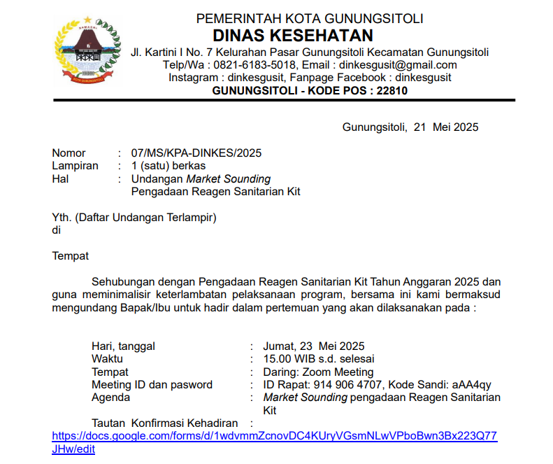 Dinas KesehatanInfo DinkesInformasi Lainnya Undangan Market Sounding Pengadaan Reagen Sanitarian Kit By Dinas Komunikasi dan Informatika - May 22, 2025 1336 0 FacebookTwitterWhatsAppPinterestTelegramPrint 3. UNDANGAN MARKET SOUNDING REAGEN SANITARIAN KITUnduh RELATED ARTICLESMORE FROM AUTHOR BPKPD Pengumuman Tentang Hasil Seleksi Administrasi dan Rekam Jejak Peserta Seleksi Terbuka Pengisian JPTP Sekda Kota Gunungsitoli Tahun 2025 BKPSDM Pengumuman Nama 3 Besar Hasil Seleksi JPT Kota Gunungsitoli Tahun 2025 BKPSDM Pengumuman Hasil Penilaian Kompetensi Manajerial dan Sosial Kultural Peserta Seleksi Terbuka Pengisian JPTP Lingkup Pemko Gunungsitoli Tahun 2025 LEAVE A REPLY Cancel reply Please enter your comment! Please enter your name here You have entered an incorrect email address! Please enter your email address here Save my name, email, and website in this browser for the next time I comment. Δ