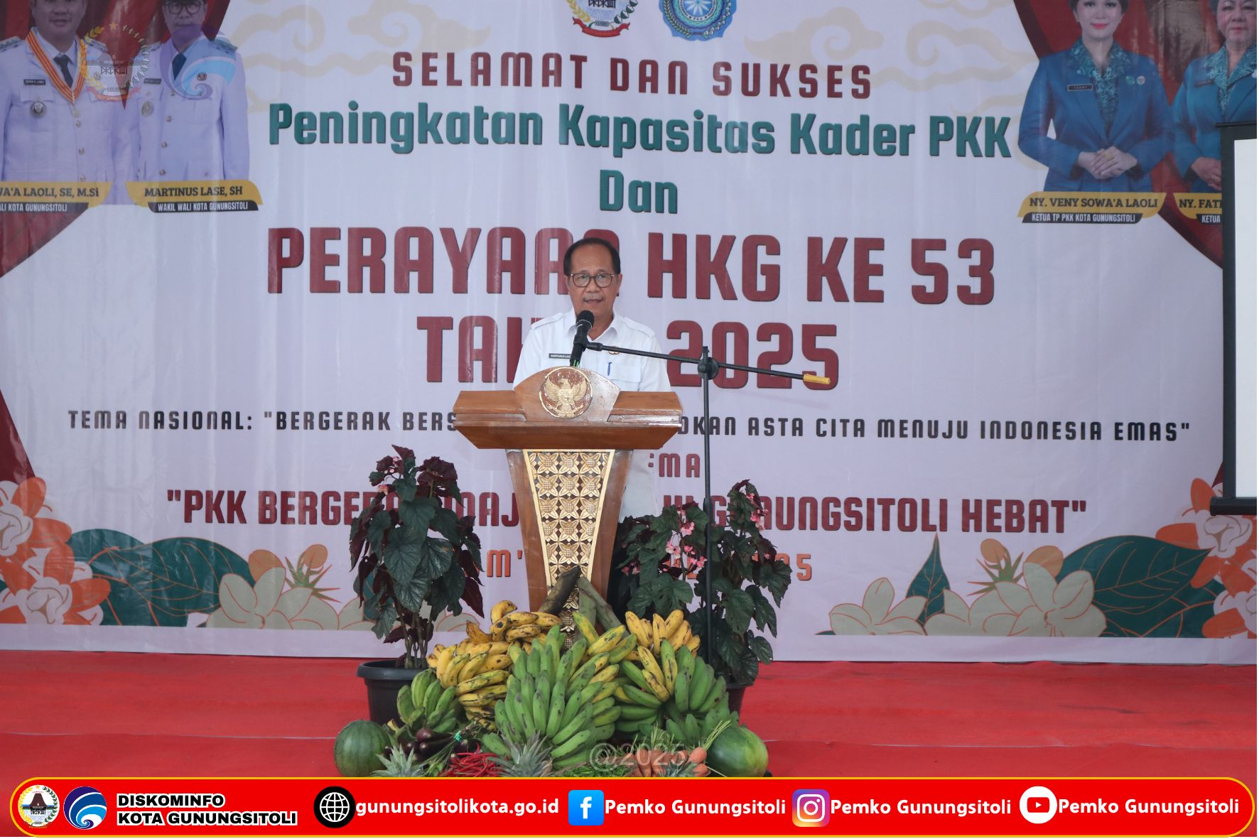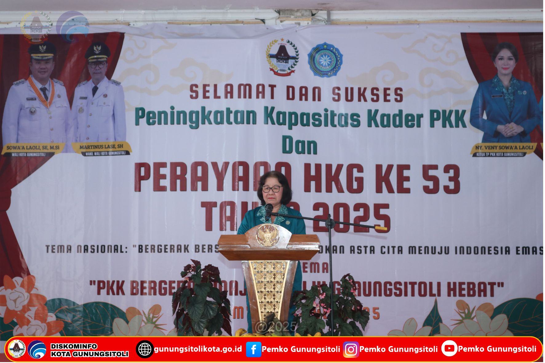 Dalam sambutannya Wakil Wali Kota Gunungsitoli menyampaikan bahwa peringatan Hari Kesatuan Gerak (HKG) PKK adalah hari dimana sebuah gerakan kader PKK berusaha untuk menyatukan dan memperkuat hubungan antar dua kelompok atau lebih untuk membentuk suatu entitas yang lebih kuat dalm mengelola 10 Program Pokok PKK dimana diharapkan mampu menaikkan derajat keilmuan dan keterampilan masyarakat pada umumnya dan kader PKK pada khususnya.