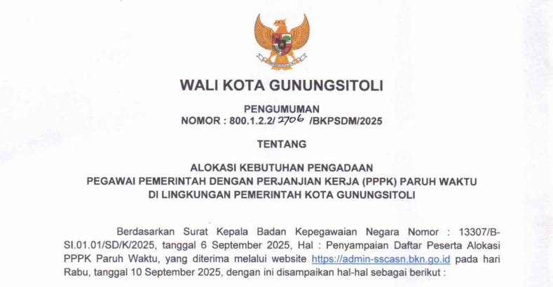 BKPSDMDokumen LainInfo BKPSDMProduk Hukum Pengumuman Alokasi Kebutuhan PPPK Paruh Waktu di Lingkup Pemko Gunungsitoli By Dinas Komunikasi dan Informatika - September 10, 2025 3651 1 FacebookTwitterWhatsAppPinterestTelegramPrint Pengumuman Alokasi Kebutuhan PPPK Paruh Waktu di Lingkungan Pemerintah Kota GunungsitoliUnduh RELATED ARTICLESMORE FROM AUTHOR BKPSDM Hasil Penilaian Prestasi dan Wawancara Peserta Seleksi Terbuka Pengisan Jabatan Pimpinan Tinggi Pratama Sekretaris Daerah Kota Gunungsitoli Tahun 2025 BKPSDM Hasil Penilaian Penulisan Makalah Peserta Seleksi Terbuka Pengisan Jabatan Pimpinan Tinggi Pratama Sekretaris Daerah Kota Gunungsitoli Tahun 2025 BPKPD Pengumuman Tentang Hasil Seleksi Administrasi dan Rekam Jejak Peserta Seleksi Terbuka Pengisian JPTP Sekda Kota Gunungsitoli Tahun 2025 1 COMMENT Ya Reply LEAVE A REPLY Cancel reply Please enter your comment! Please enter your name here You have entered an incorrect email address! Please enter your email address here Save my name, email, and website in this browser for the next time I comment. Δ