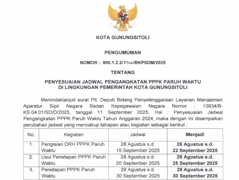 BKPSDMDokumen LainInfo BKPSDMProduk Hukum Penyesuaian Jadwal pengangkatan PPPK Paruh Waktu di Lingkup Pemko Gunungsitoli By Dinas Komunikasi dan Informatika - September 12, 2025 776 0 FacebookTwitterWhatsAppPinterestTelegramPrint Penyesuaian Jadwal pengangkatan PPPK Paruh Waktu_000074Unduh RELATED ARTICLESMORE FROM AUTHOR BKPSDM Hasil Penilaian Prestasi dan Wawancara Peserta Seleksi Terbuka Pengisan Jabatan Pimpinan Tinggi Pratama Sekretaris Daerah Kota Gunungsitoli Tahun 2025 BKPSDM Hasil Penilaian Penulisan Makalah Peserta Seleksi Terbuka Pengisan Jabatan Pimpinan Tinggi Pratama Sekretaris Daerah Kota Gunungsitoli Tahun 2025 BPKPD Pengumuman Tentang Hasil Seleksi Administrasi dan Rekam Jejak Peserta Seleksi Terbuka Pengisian JPTP Sekda Kota Gunungsitoli Tahun 2025 LEAVE A REPLY Cancel reply Please enter your comment! Please enter your name here You have entered an incorrect email address! Please enter your email address here Save my name, email, and website in this browser for the next time I comment. Δ