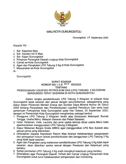 Berita SURAT EDARAN NOMOR 900.1.3.5/ 5515 EK/2025 TENTANG PENGGUNAAN LIQUIFIED PETROLEUM GAS (LPG) TABUNG 3 KILOGRAM BERSUBSIDI TEPAT SASARAN DI KOTA GUNUNGSITOLI By Dinas Komunikasi dan Informatika - September 3, 2025 551 0 FacebookTwitterWhatsAppPinterestTelegramPrint CamScanner 03-09-2025 17.23Unduh RELATED ARTICLESMORE FROM AUTHOR Berita Syukuran Natal dan Tahun Baru Dinas Pendidikan, Wakil Wali Kota Tegaskan Komitmen Majukan Pendidikan Berita Pemko Gunungsitoli Imbau Masyarakat Patuhi Aturan Karantina Hewan, 227 Ekor Babi Ilegal Dimusnahkan Berita Wali Kota Gunungsitoli Serahkan Bantuan Benih dan Saprodi Pertanian kepada Kelompok Tani LEAVE A REPLY Cancel reply Please enter your comment! Please enter your name here You have entered an incorrect email address! Please enter your email address here Save my name, email, and website in this browser for the next time I comment. Δ
