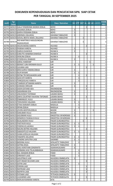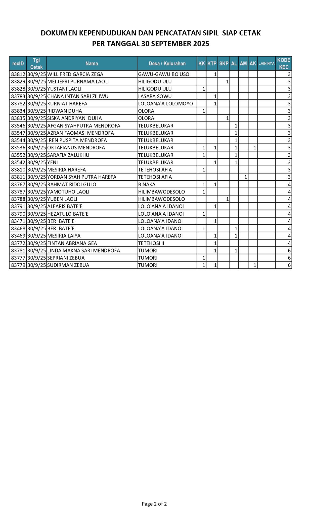 Berikut disampaikan daftar dokumen kependudukan dan pencatatan sipil yang telah siap cetak per tanggal 30 September 2025 sebagaimana terlampir: