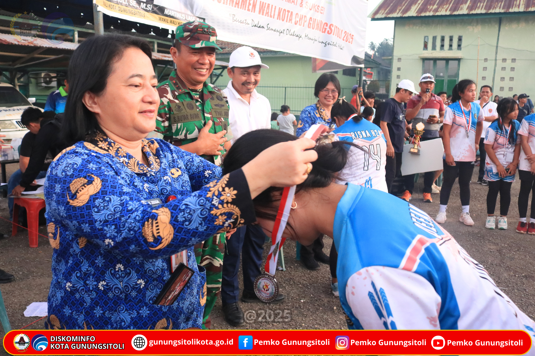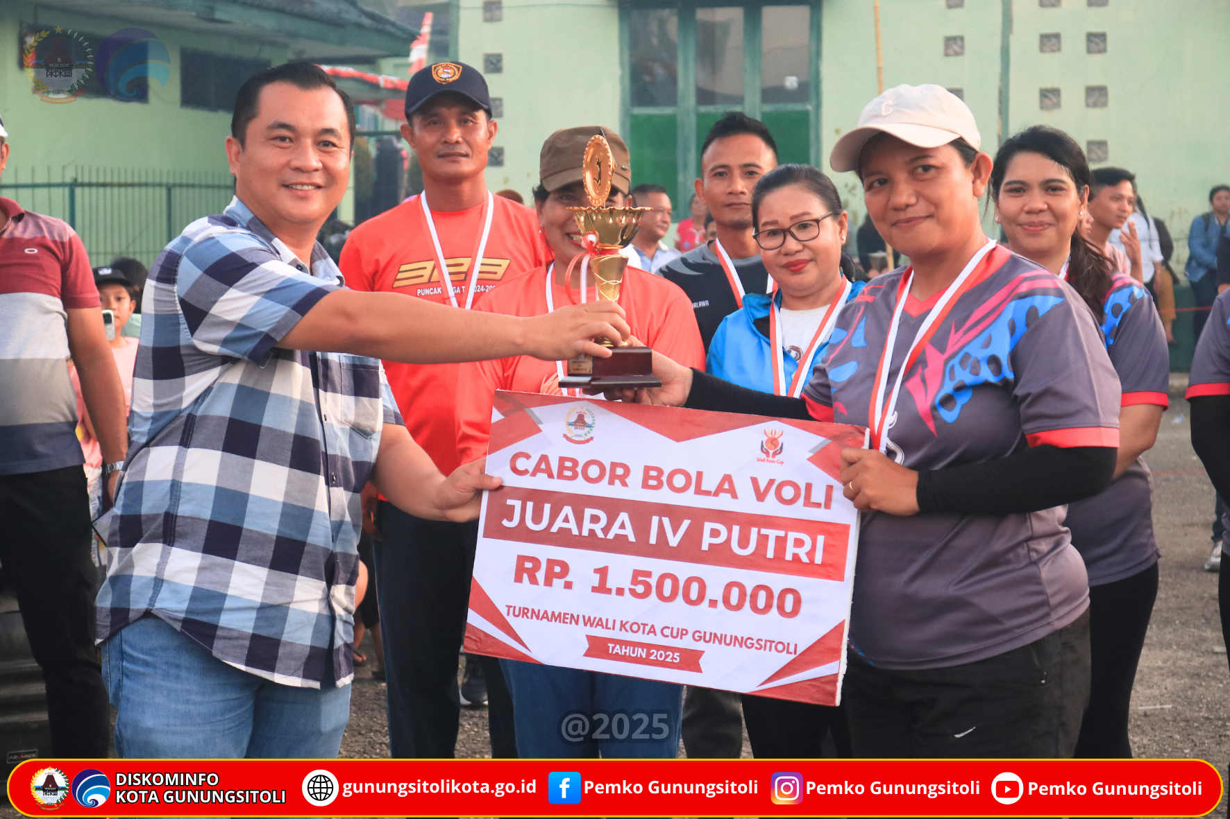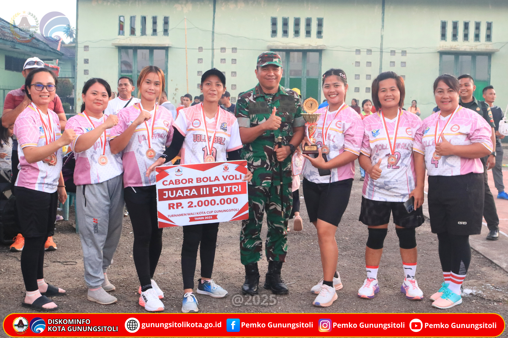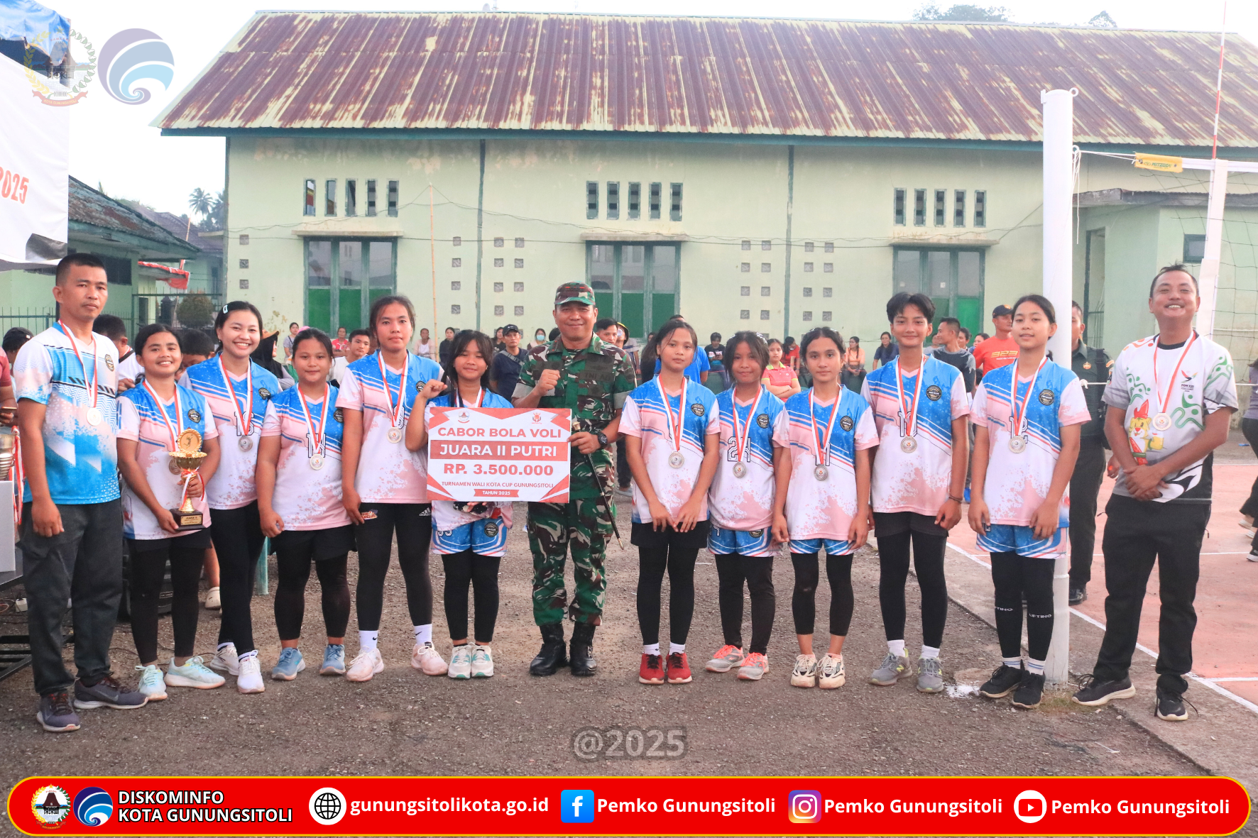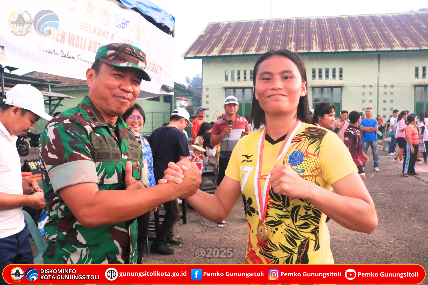 Gunungsitoli (28/10/2025) Dandim 0213/Nias Letkol Inf Sampe T. Butar Butar mewakili Wali Kota Gunungsitoli menyerahkan hadiah kepada para pemenang Turnamen Wali Kota Gunungsitoli Cup Tahun 2025 cabang olahraga bola voli putri yang berlangsung di Lapangan Makodim 0213/Nias, Senin (28/10/2025).