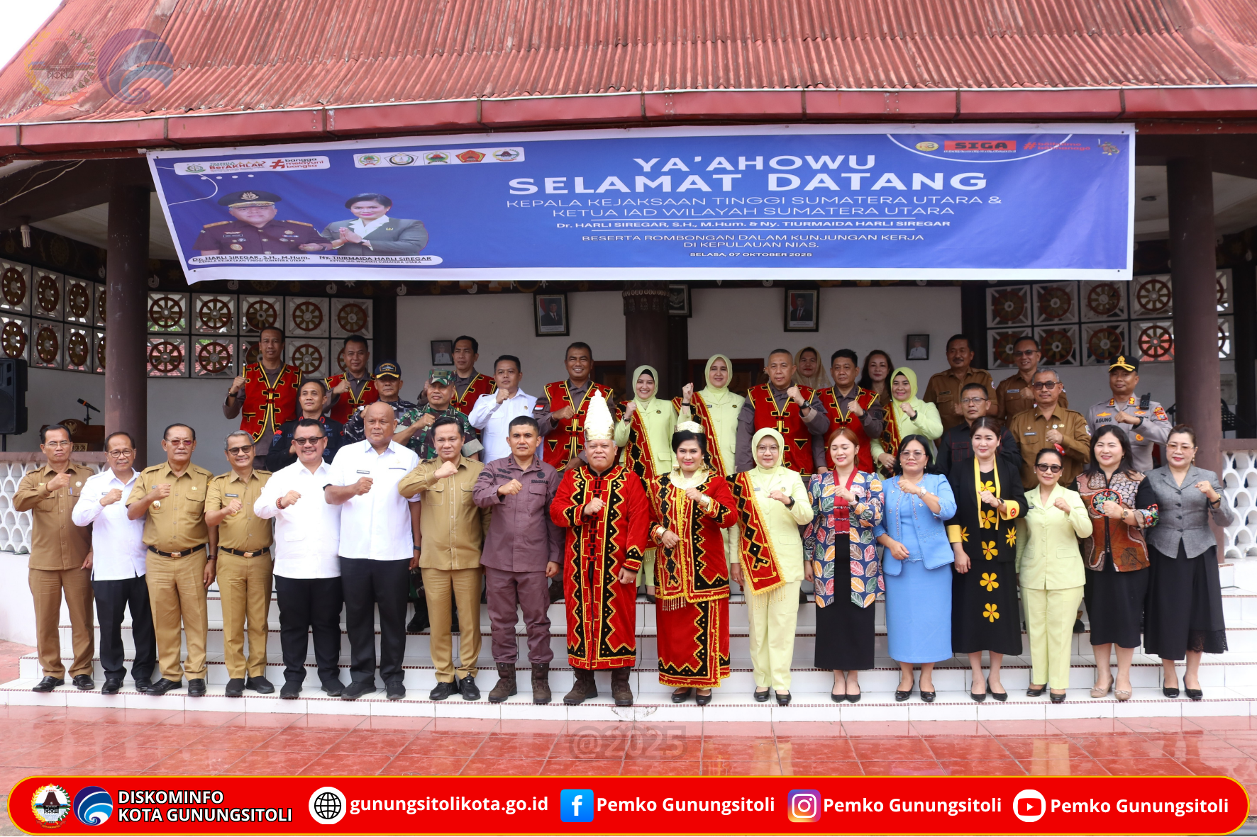 Gunungsitoli (07/10/2025) Wali Kota Gunungsitoli Sowa’a Laoli, S.E., M.Si didampingi Wakil Wali Kota Martinus Kase, S.H, menyambut kedatangan Kepala Kejaksaan Tinggi Sumatera Utara, Dr. Harli Siregar, S.H., M.Hum., bersama Ketua Ikatan Adhyaksa Dharmakarini (IAD) Wilayah Sumut, Ny. Tiurmaida Harli Siregar, serta rombongan dalam rangka kunjungan kerja di wilayah hukum Kejaksaan Negeri Gunungsitoli, Selasa (7/10/25).