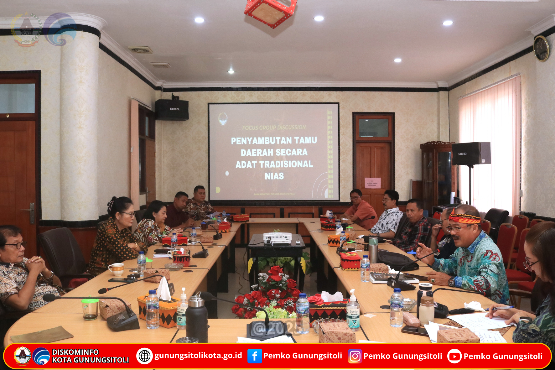 Gunungsitoli (20/11/2025) – Pj. Sekretaris Daerah Kota Gunungsitoli, Meiman Kristian Harefa, S.Sos., MSP., didampingi Kepala Bagian Protokol dan Komunikasi Pimpinan Setda Kota Gunungsitoli, Fitelinamawati Hulu, SE., M.Si., memimpin pelaksanaan Focus Group Discussion (FGD) dalam rangka penyusunan dan penyelarasan Peraturan Wali Kota Gunungsitoli tentang Keprotokolan. FGD ini digelar sebagai langkah awal untuk merumuskan pedoman resmi terkait tata upacara, pelayanan tamu daerah, serta pelaksanaan prosesi adat tradisional Nias dalam setiap kegiatan pemerintahan, berlangsung di Ruang Rapat Center Kantor Wali Kota Gunungsitoli, Kamis (20/11/2025).