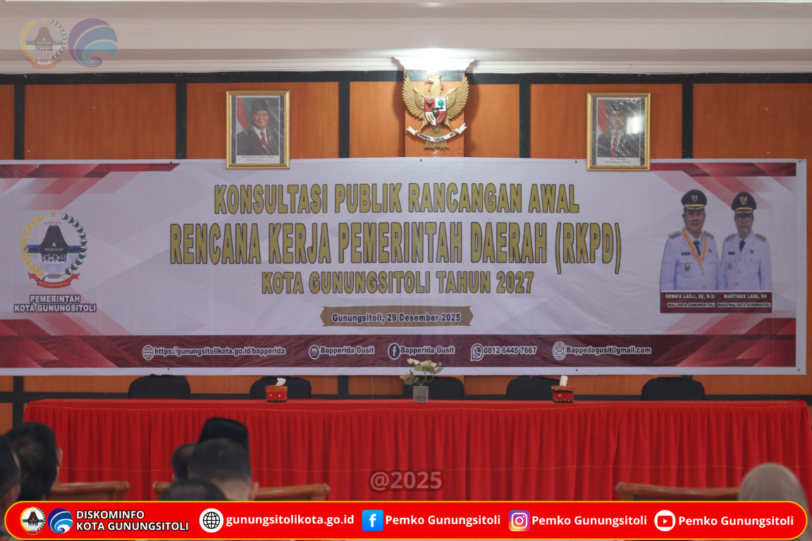 Gunungsitoli (29/12/2025) Wali Kota Gunungsitoli, Sowa’a Laoli, S.E., M.Si., didampingi Wakil Wali Kota Gunungsitoli, Martinus Lase, S.H., menghadiri Forum Konsultasi Publik Rencana Kerja Pemerintah Daerah (RKPD) Kota Gunungsitoli Tahun 2027 yang dilaksanakan di Ruang Rapat II Kantor Wali Kota Gunungsitoli, Senin (29/12/2025).