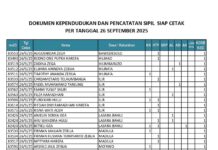 Berikut disampaikan daftar dokumen kependudukan dan pencatatan sipil yang telah siap cetak per tanggal 26 September 2025 sebagaimana terlampir: