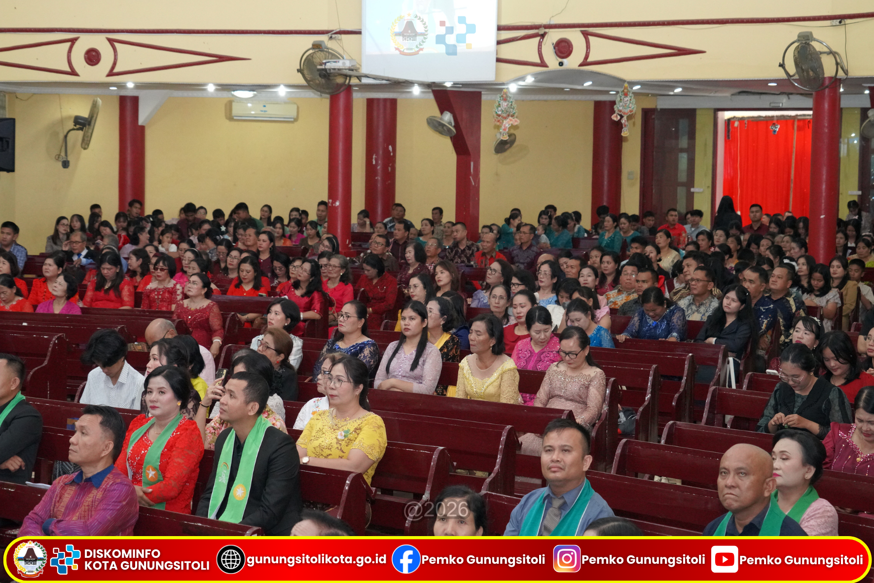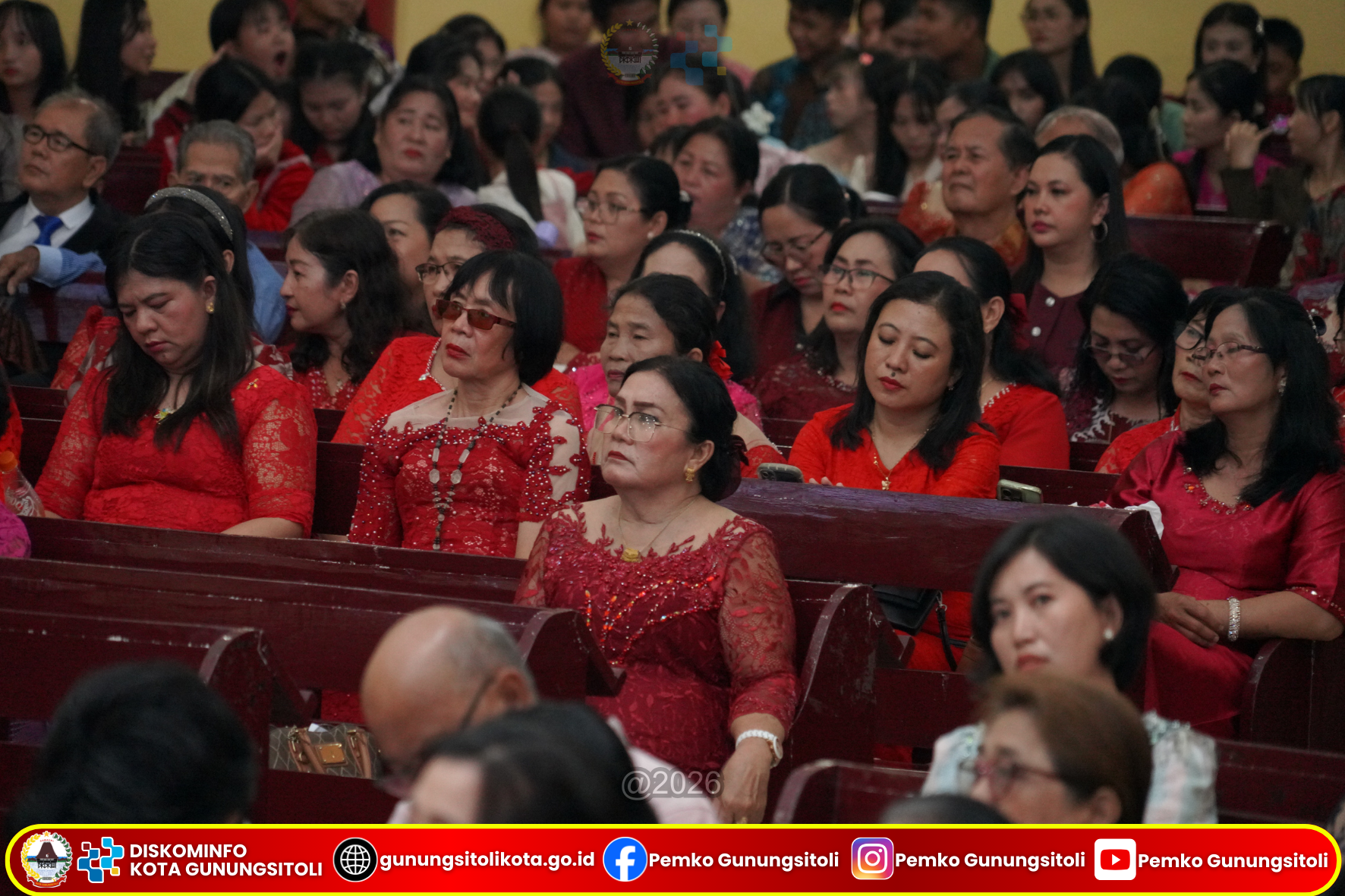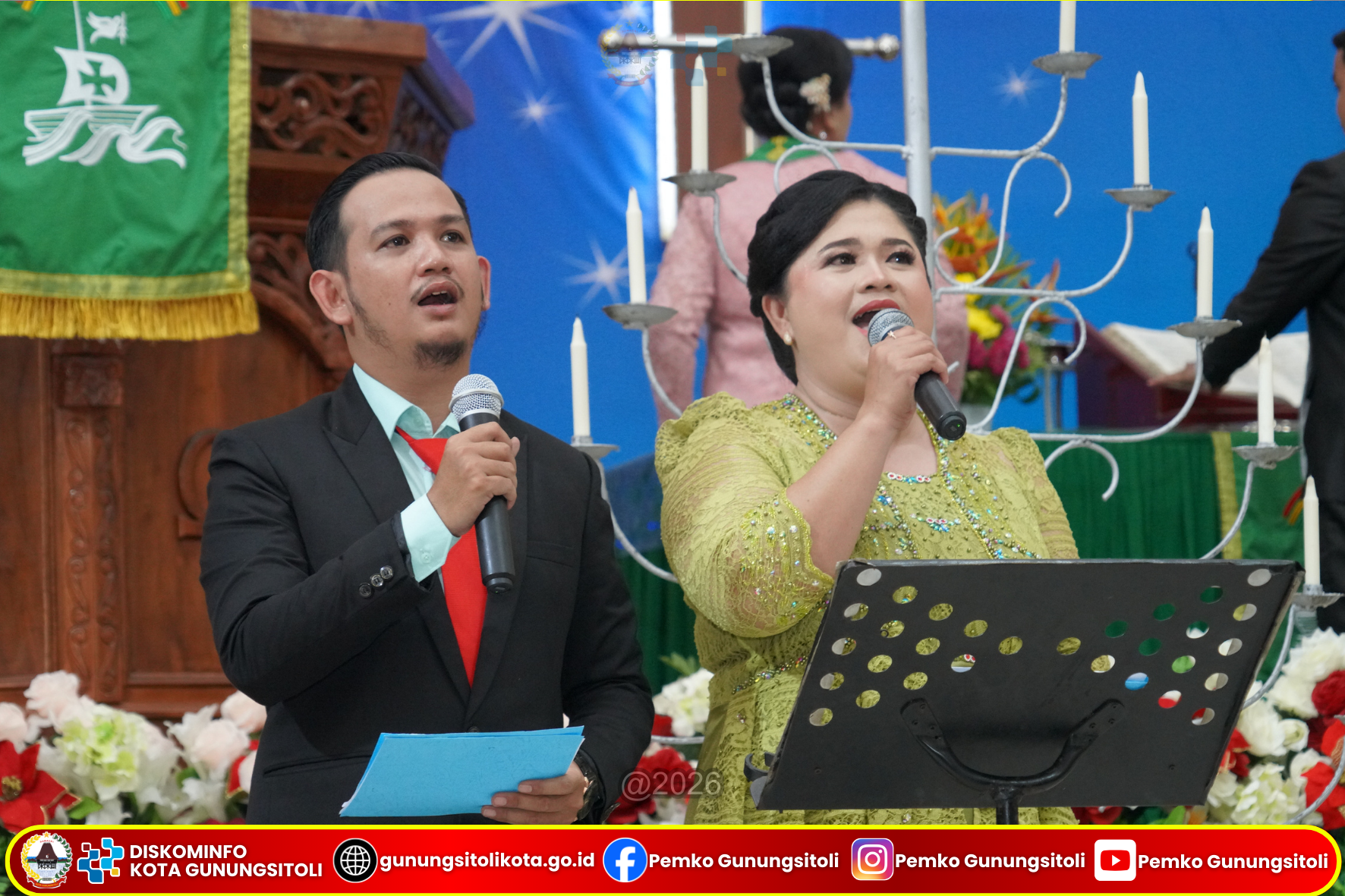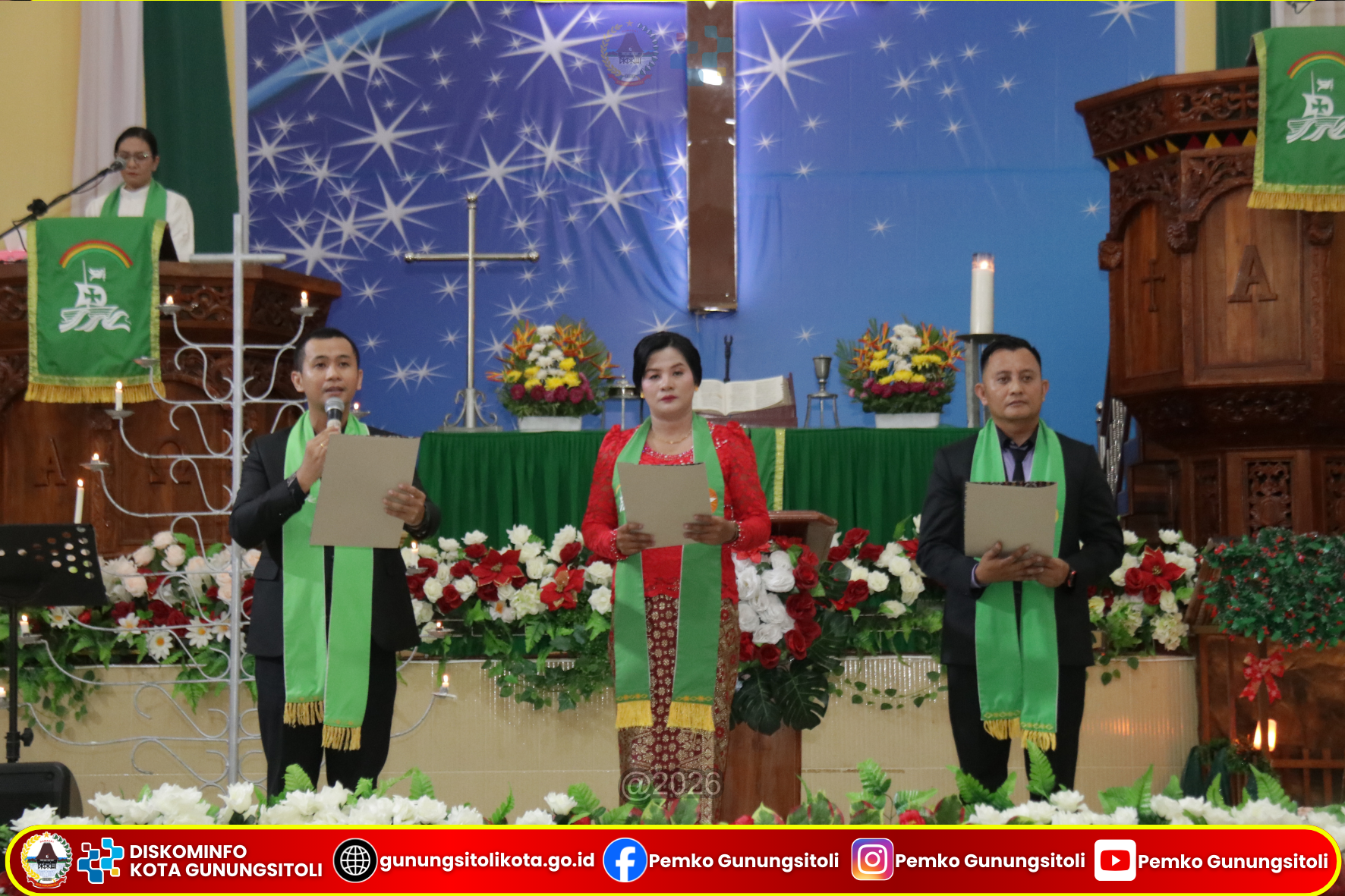 Gunungsitoli (18/01/2026) Wali Kota Gunungsitoli, Sowa’a Laoli, S.E., M.Si., didampingi Pj. Sekretaris Daerah Kota Gunungsitoli Meiman Kristian Harefa, S.Sos., M.S.P., serta Ketua Dharma Wanita Persatuan (DWP) Kota Gunungsitoli Ny. Dita Meiman Harefa, menghadiri Ibadah Natal dan Syukuran Tahun Baru 2026 Resort 1 BNKP yang dilaksanakan di Gedung Gereja BNKP Kota Gunungsitoli, Sabtu (17/01/2026).