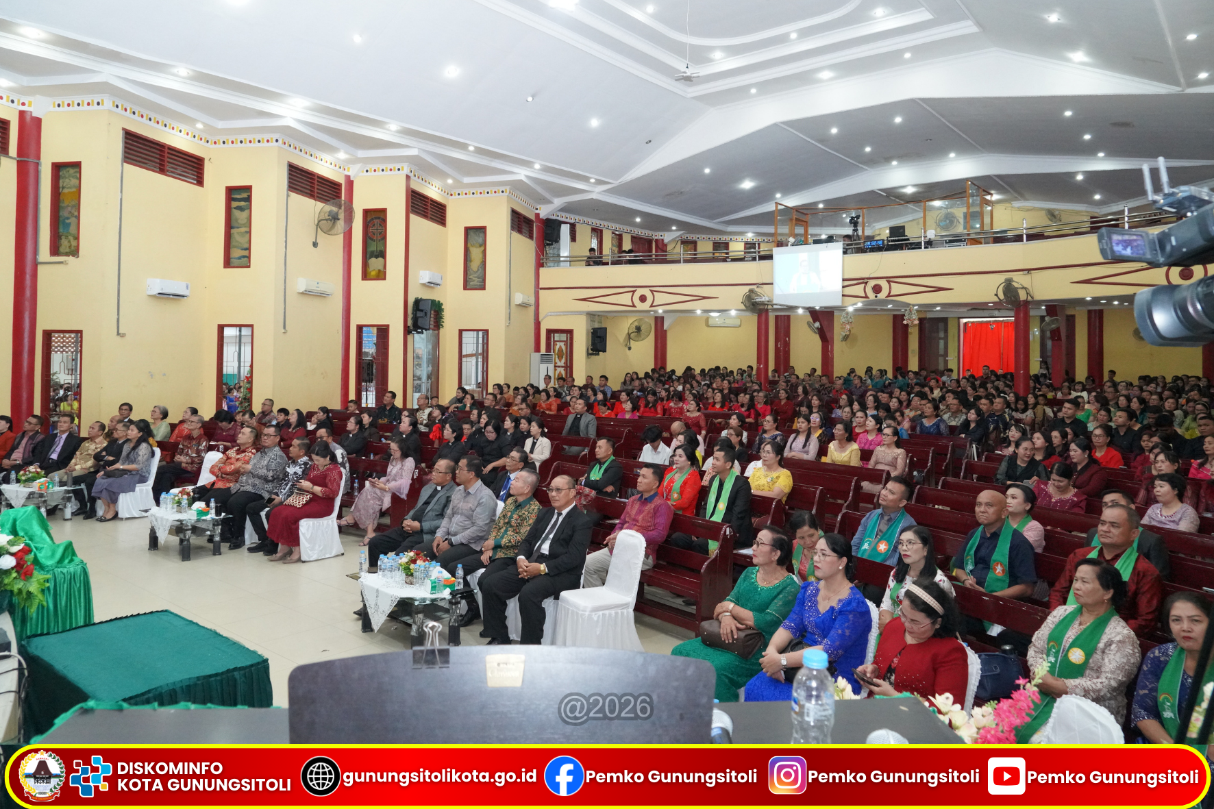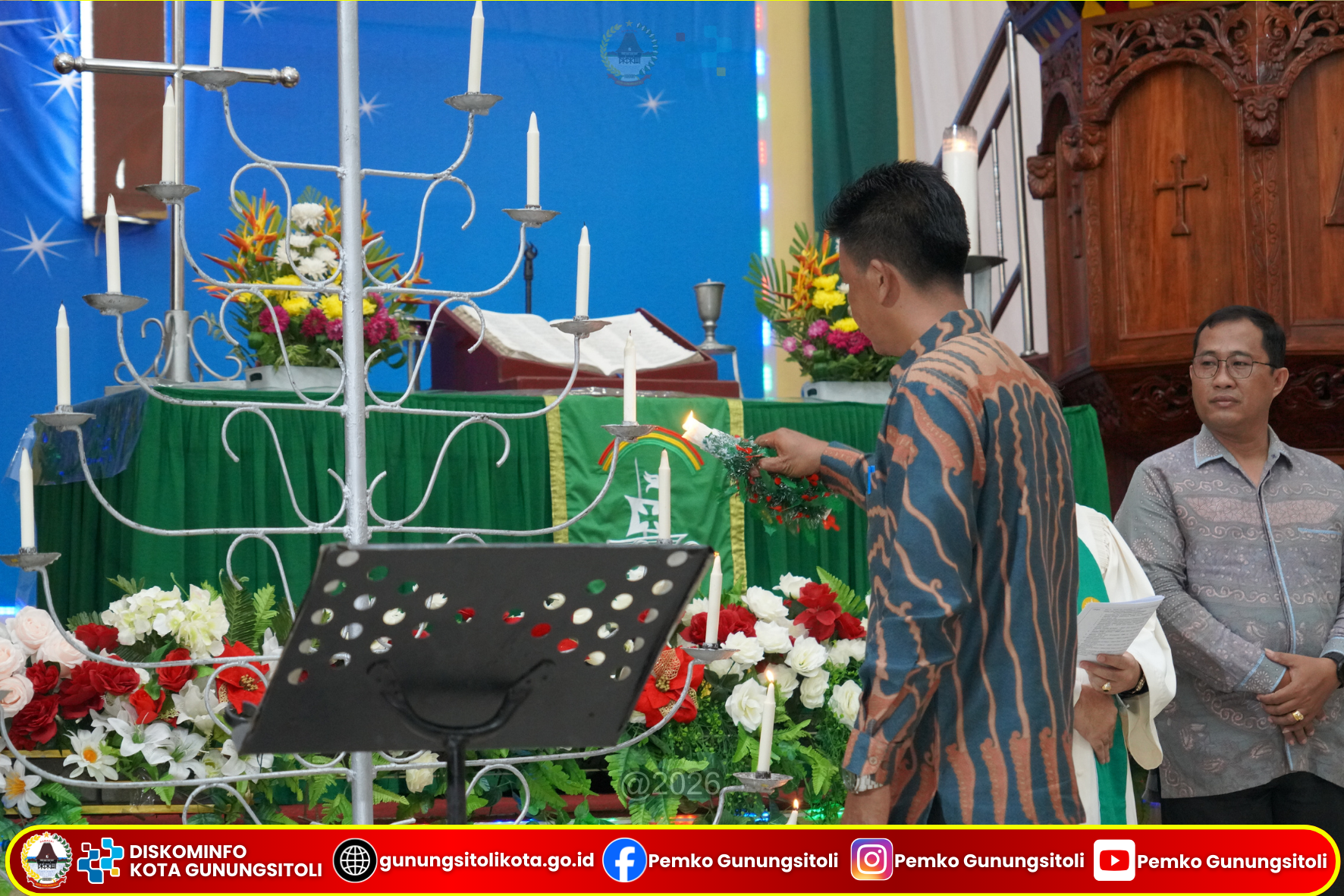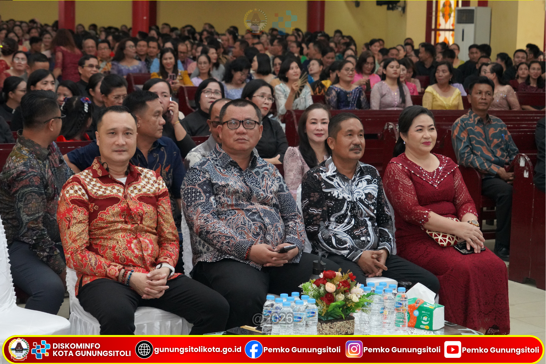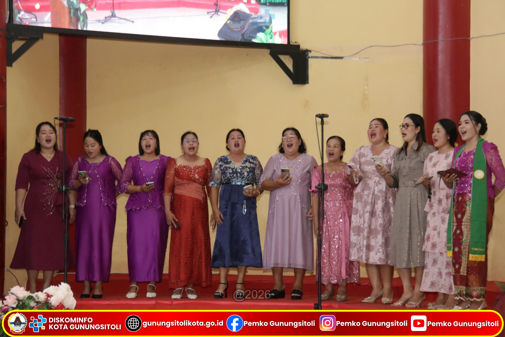 Gunungsitoli (18/01/2026) Wali Kota Gunungsitoli, Sowa’a Laoli, S.E., M.Si., didampingi Pj. Sekretaris Daerah Kota Gunungsitoli Meiman Kristian Harefa, S.Sos., M.S.P., serta Ketua Dharma Wanita Persatuan (DWP) Kota Gunungsitoli Ny. Dita Meiman Harefa, menghadiri Ibadah Natal dan Syukuran Tahun Baru 2026 Resort 1 BNKP yang dilaksanakan di Gedung Gereja BNKP Kota Gunungsitoli, Sabtu (17/01/2026).