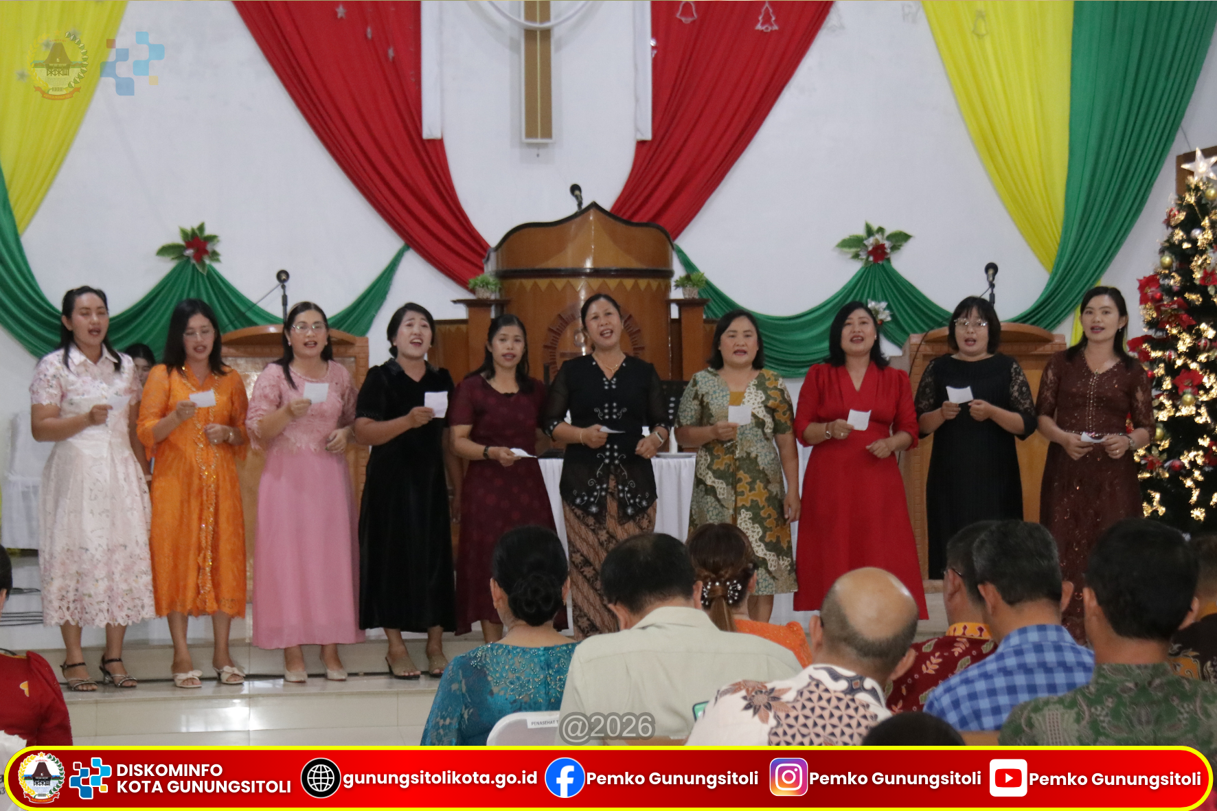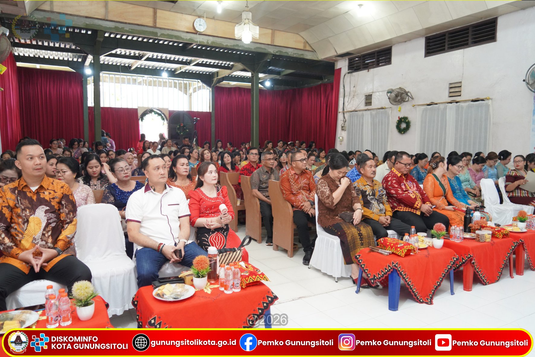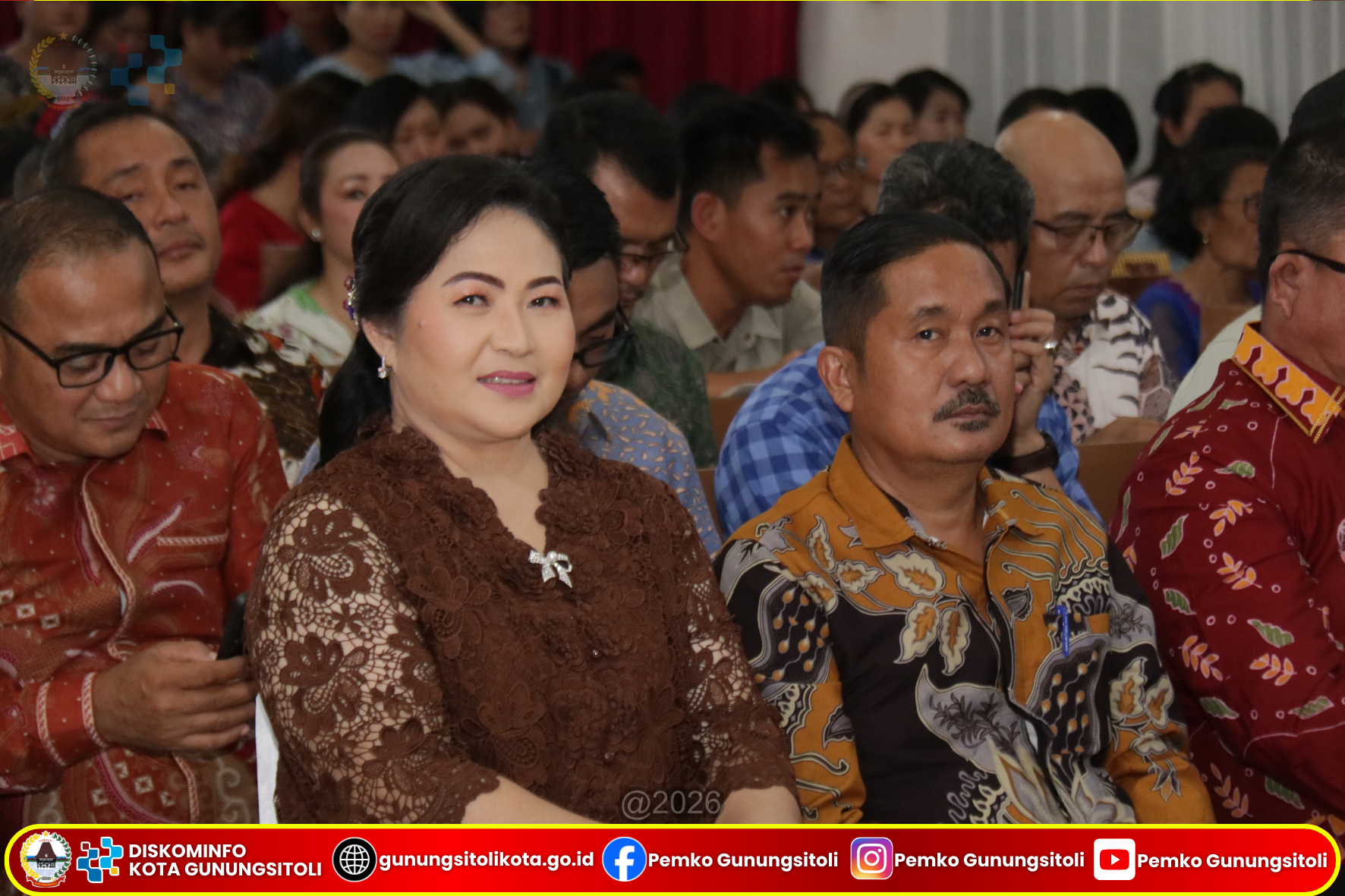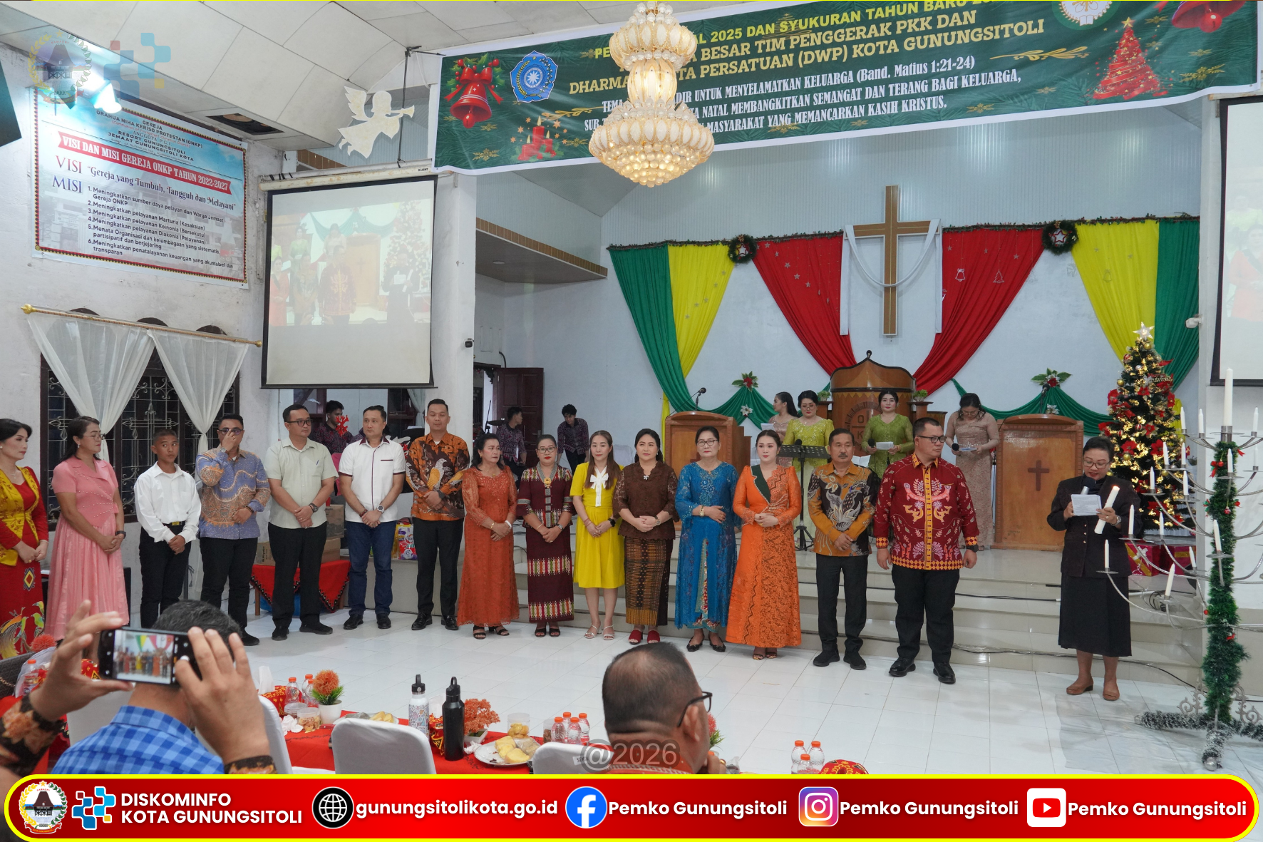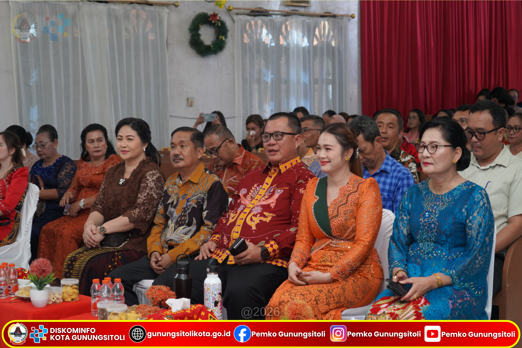 Gunungsitoli, (15/1/2026) Wali Kota Gunungsitoli, Sowa’a Laoli, S.E., M.Si., didampingi Pj. Sekretaris Daerah Kota Gunungsitoli, Meiman Kristian Harefa, S.Sos., M.S.P., serta Ketua TP. PKK Kota Gunungsitoli, Ny. Veny Sowa’a Laoli, didampingi Ketua DWP Kota Gunungsitoli, Ny. Dita Meiman Harefa, menghadiri Ibadah Natal dan Syukuran Tahun Baru TP. PKK dan Dharma Wanita Persatuan (DWP) Kota Gunungsitoli yang dilaksanakan di Gereja ONKP Kota Gunungsitoli, Kamis (15/1/2026).