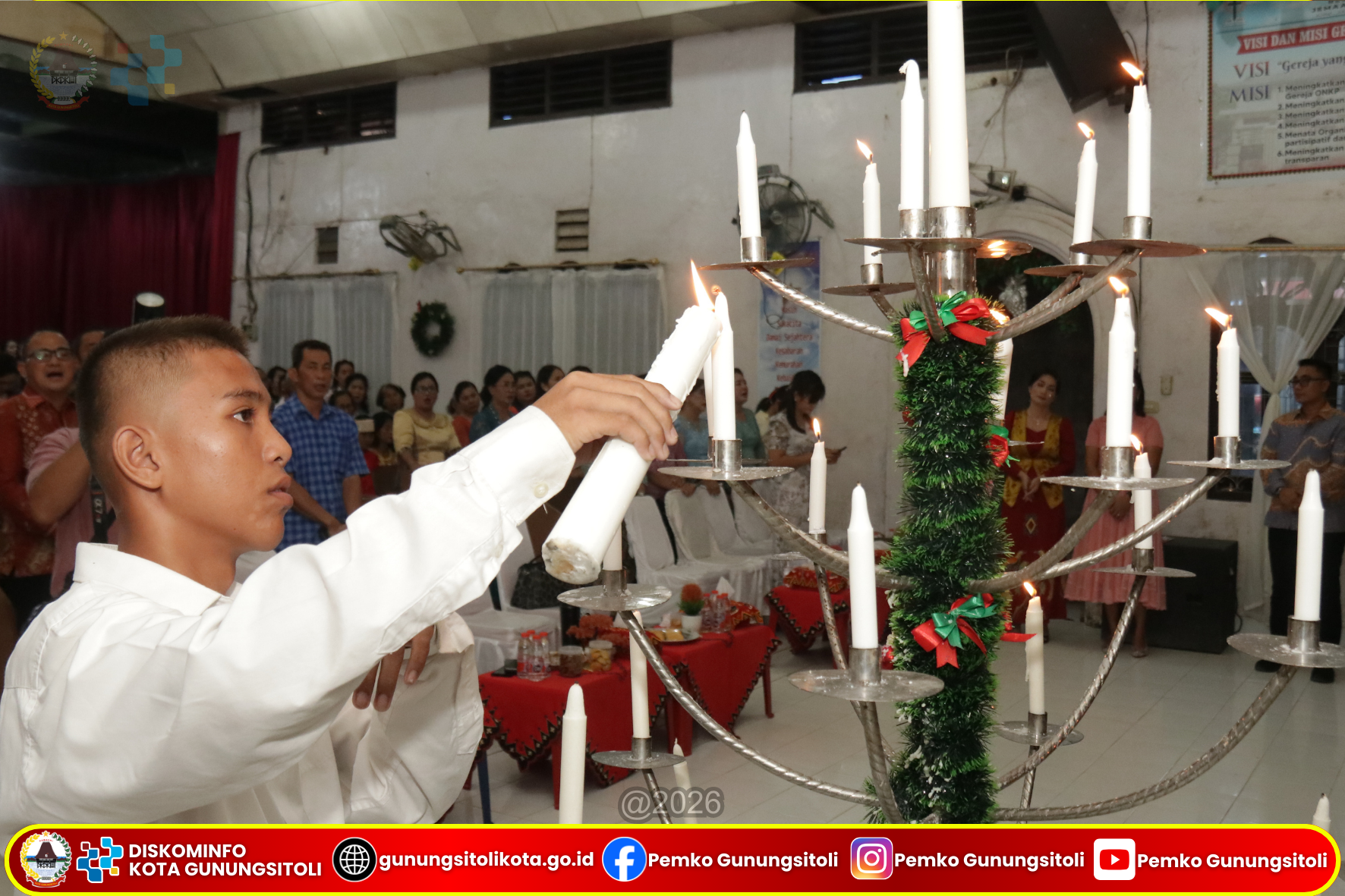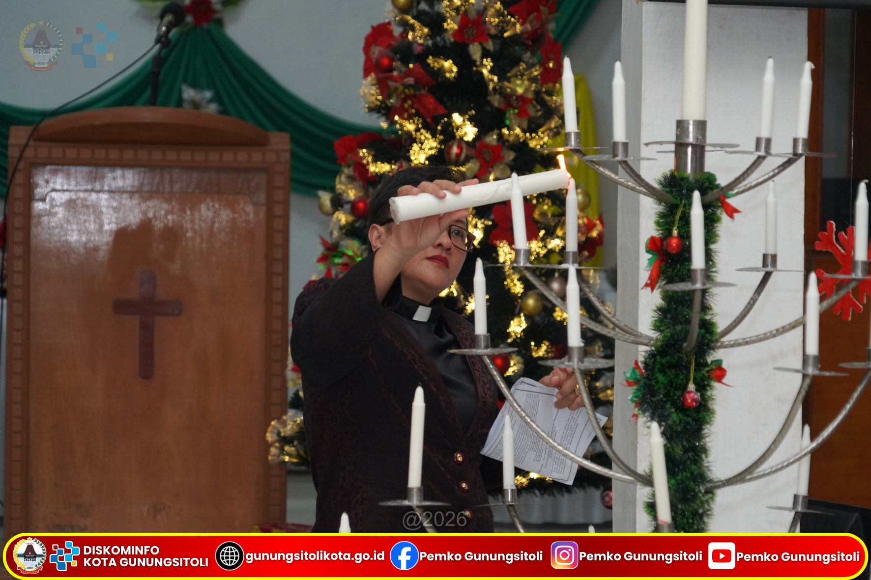 Ibadah Natal dipimpin oleh Pendeta Pengkhotbah, Pdt. Feeling S. Waruwu, S.Th., dengan mengangkat tema “Allah Hadir untuk Menyelamatkan Keluarga (Matius 1:21–24)” dan subtema “Gema sukacita Natal membangkitkan semangat dan kerinduan untuk menjadi pembawa damai dan terang bagi keluarga, organisasi, dan masyarakat yang memancarkan kasih Kristus.”