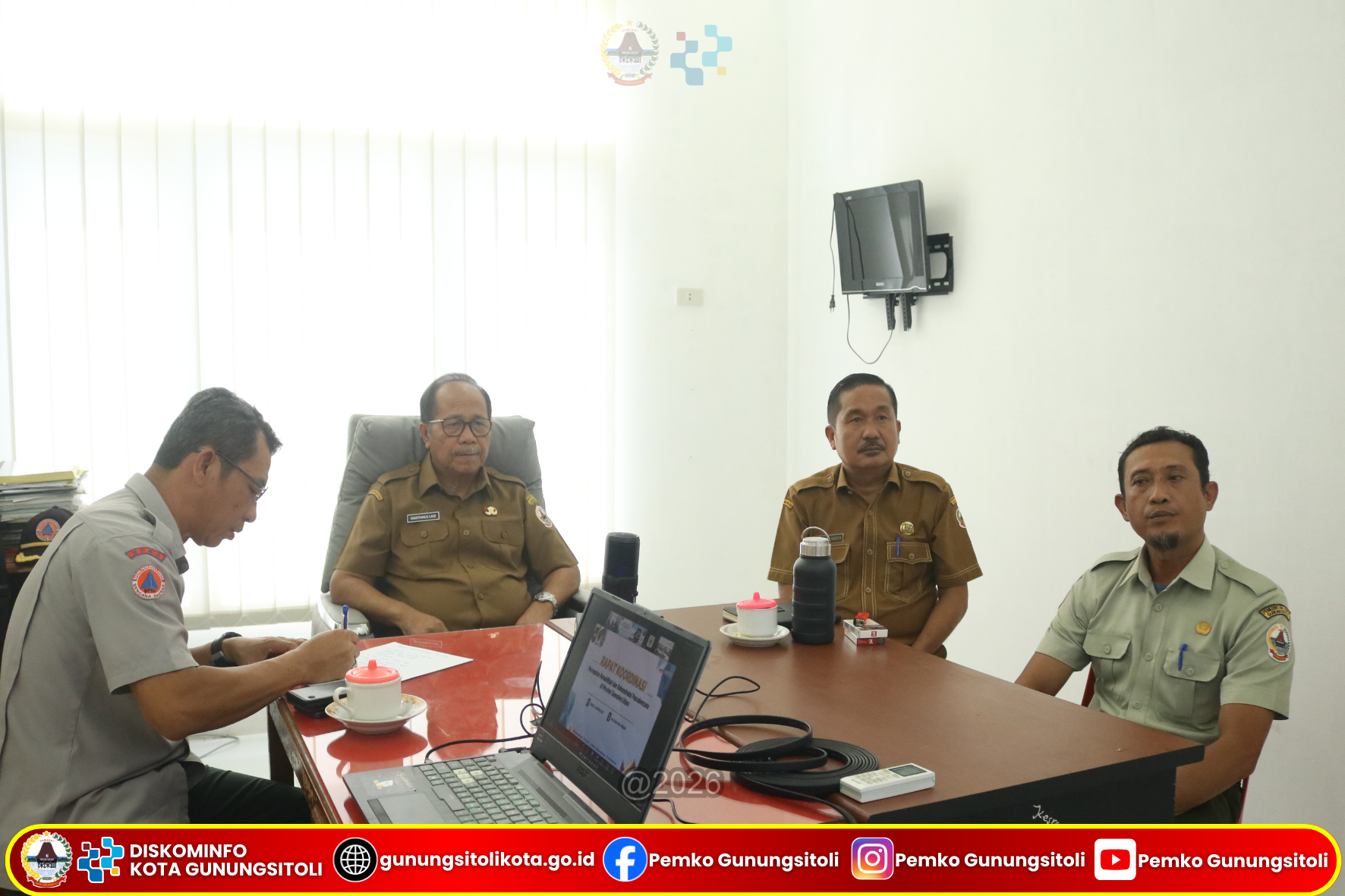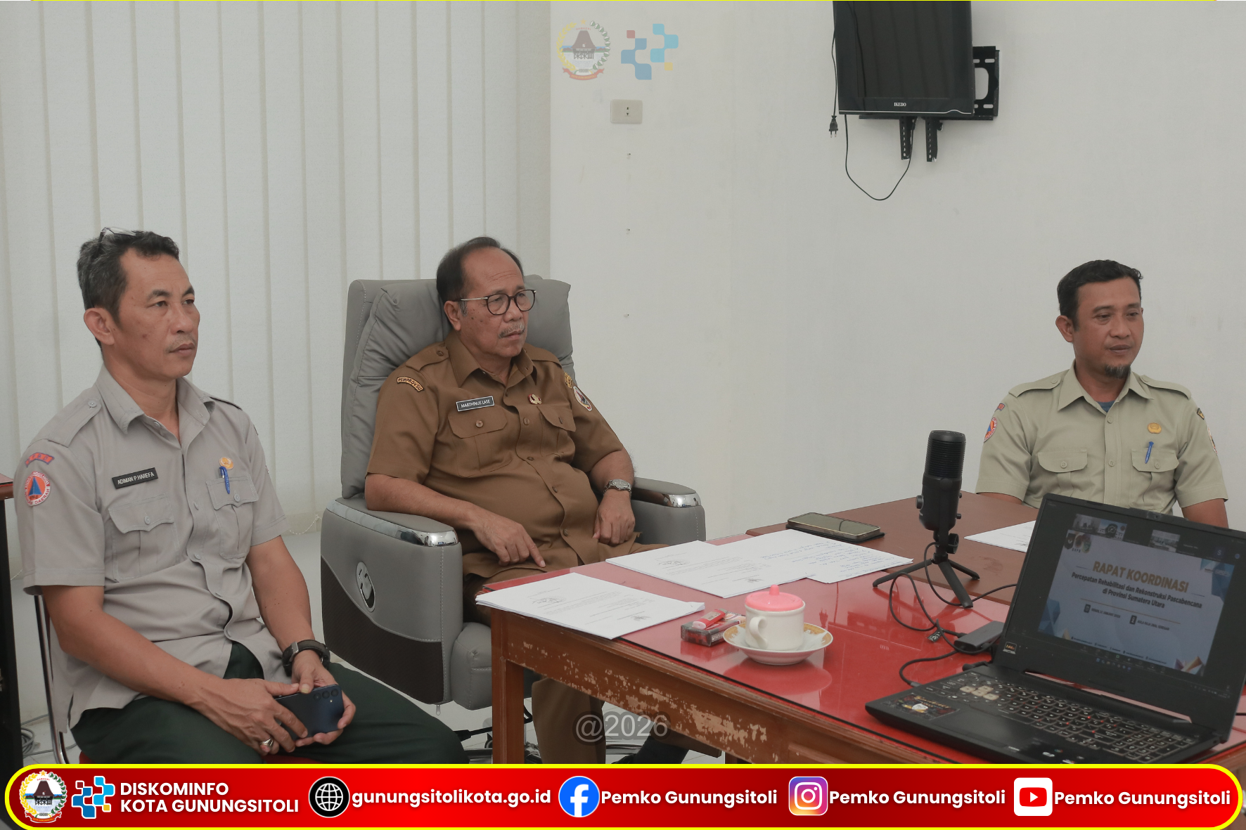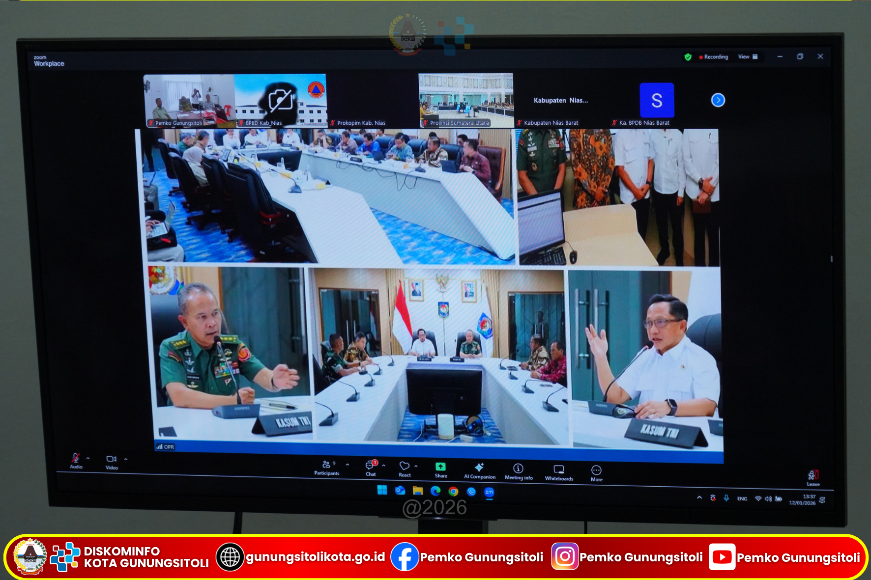 Gunungsitoli (12/1/2026) Wakil Wali Kota Gunungsitoli, Martinus Lase, S.H., didampingi Penjabat Sekretaris Daerah Kota Gunungsitoli Meiman Kristian Harefa, S.Sos., M.S.P. serta Kepala Pelaksana BPBD Kota Gunungsitoli Adiman Perwira Harefa, S.Th., M.Si., mengikuti Rapat Koordinasi Percepatan Rehabilitasi dan Rekonstruksi Pascabencana Provinsi Sumatera Utara yang diselenggarakan secara daring melalui Zoom Meeting bersama Menteri Dalam Negeri Republik Indonesia Muhammad Tito Karnavian, bertempat di Ruang Rapat Kantor Dinas Komunikasi dan Informatika Kota Gunungsitoli, Senin (12/1/2026).