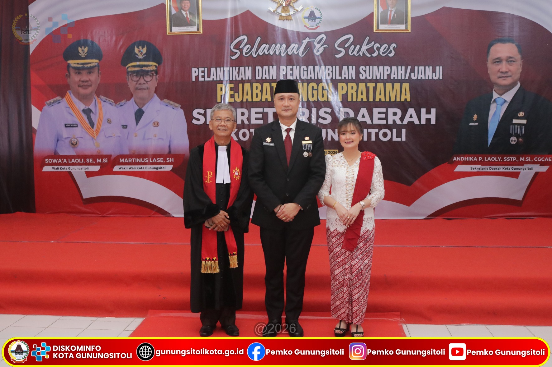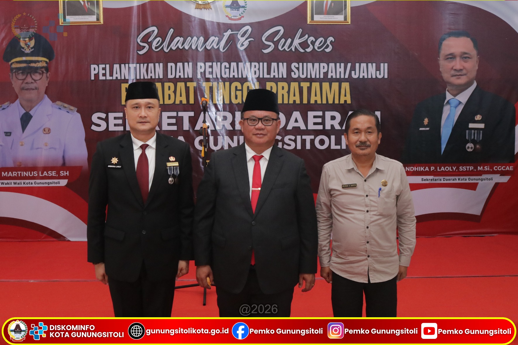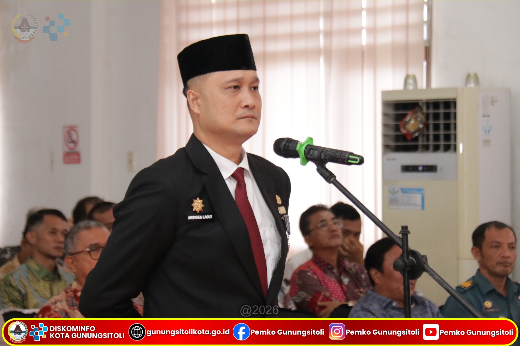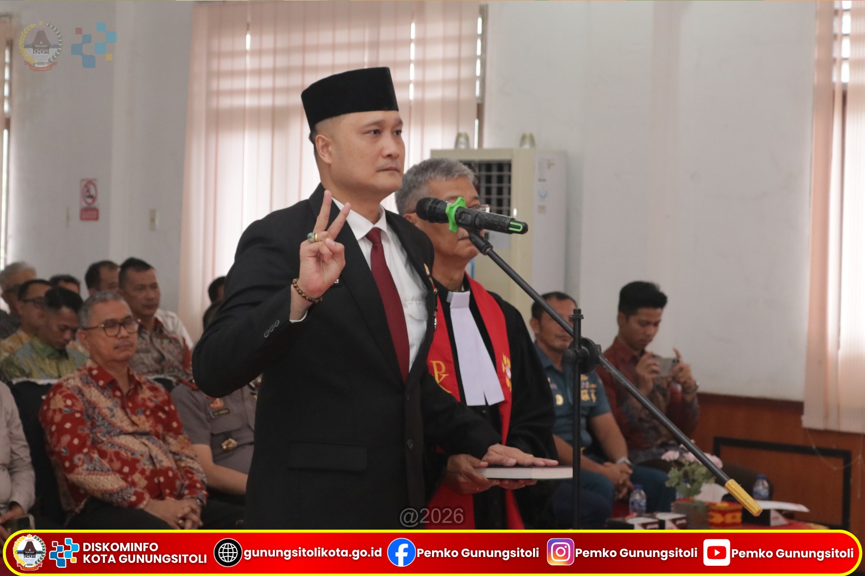 Gunungsitoli (30/01/2026) Wali Kota Gunungsitoli, Sowa’a Laoli, S.E., M.Si., melantik dan mengambil sumpah/janji jabatan Sekretaris Daerah Kota Gunungsitoli Andhika P. Laoly, SSTP., M.Si., CGCAE yang dirangkaikan dengan acara serah terima jabatan, bertempat di Ruang Rapat II Kantor Wali Kota Gunungsitoli, Jumat (30/1/26).