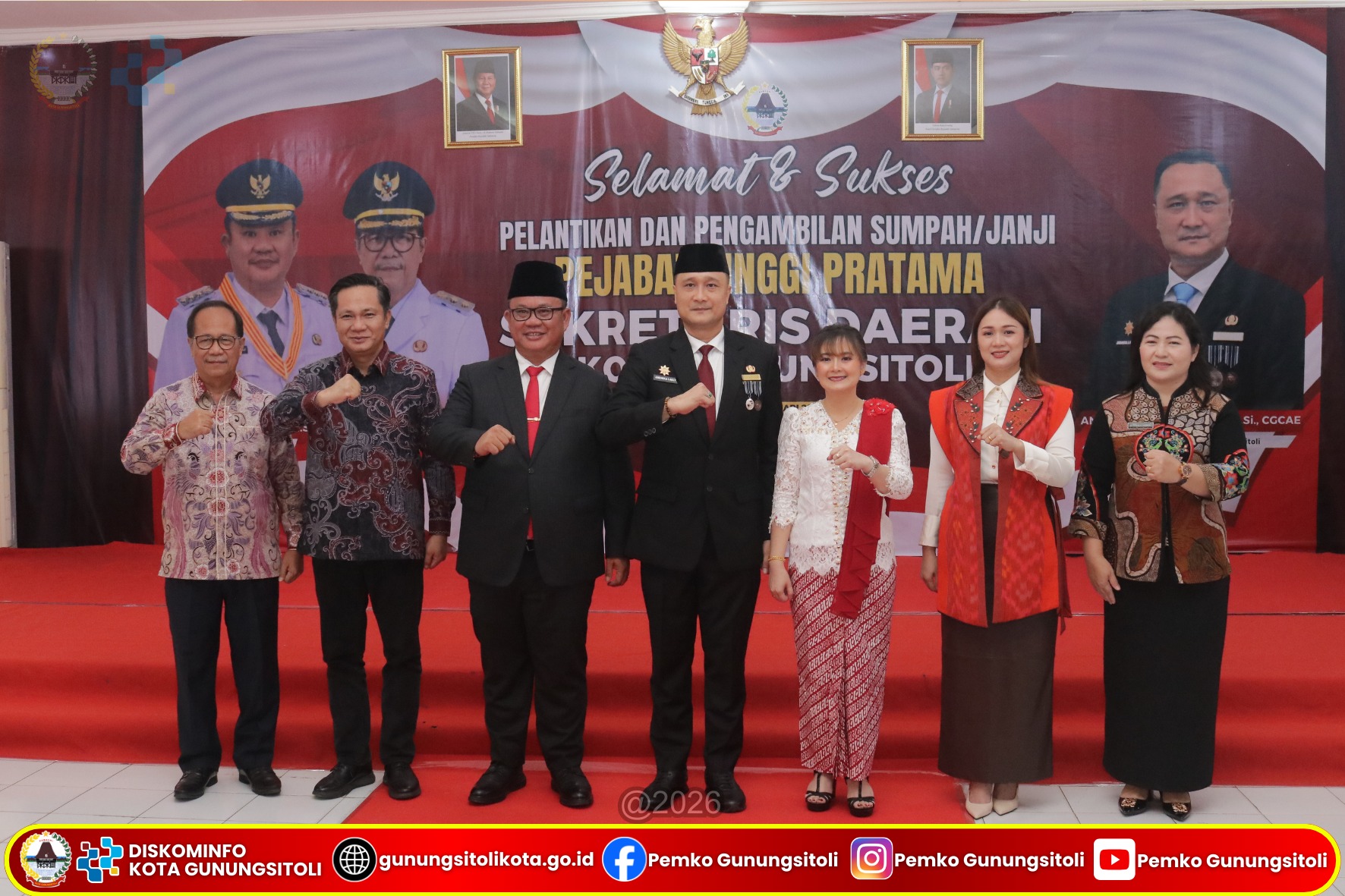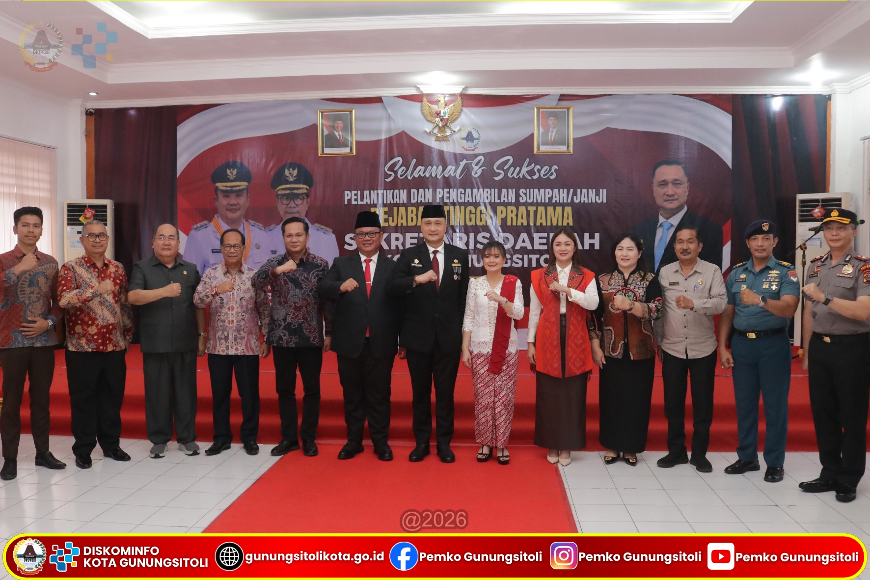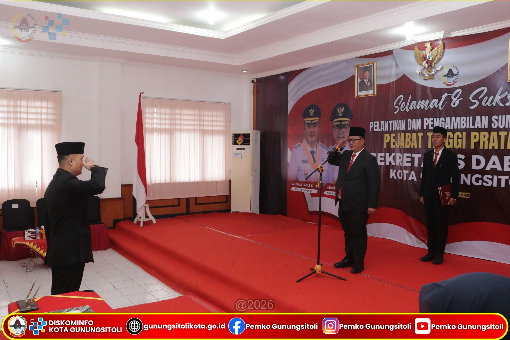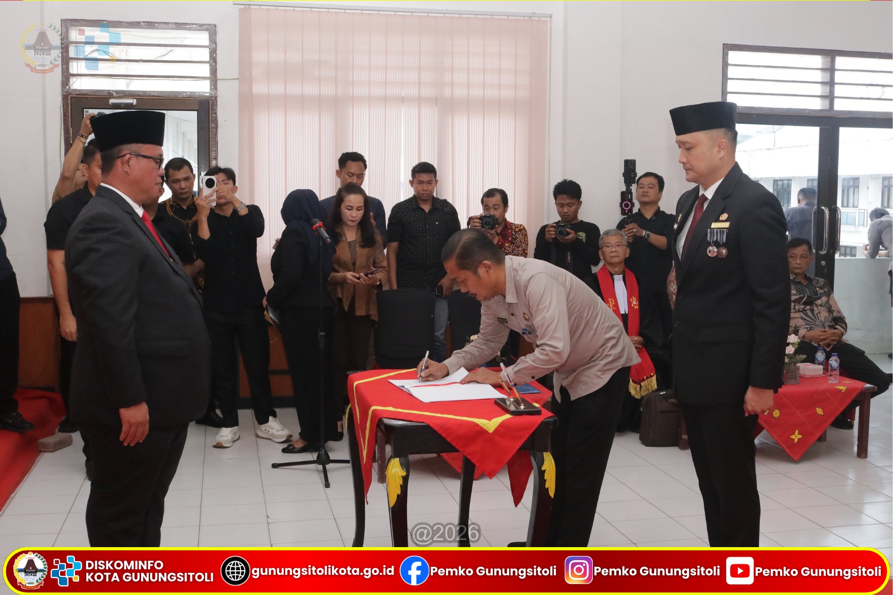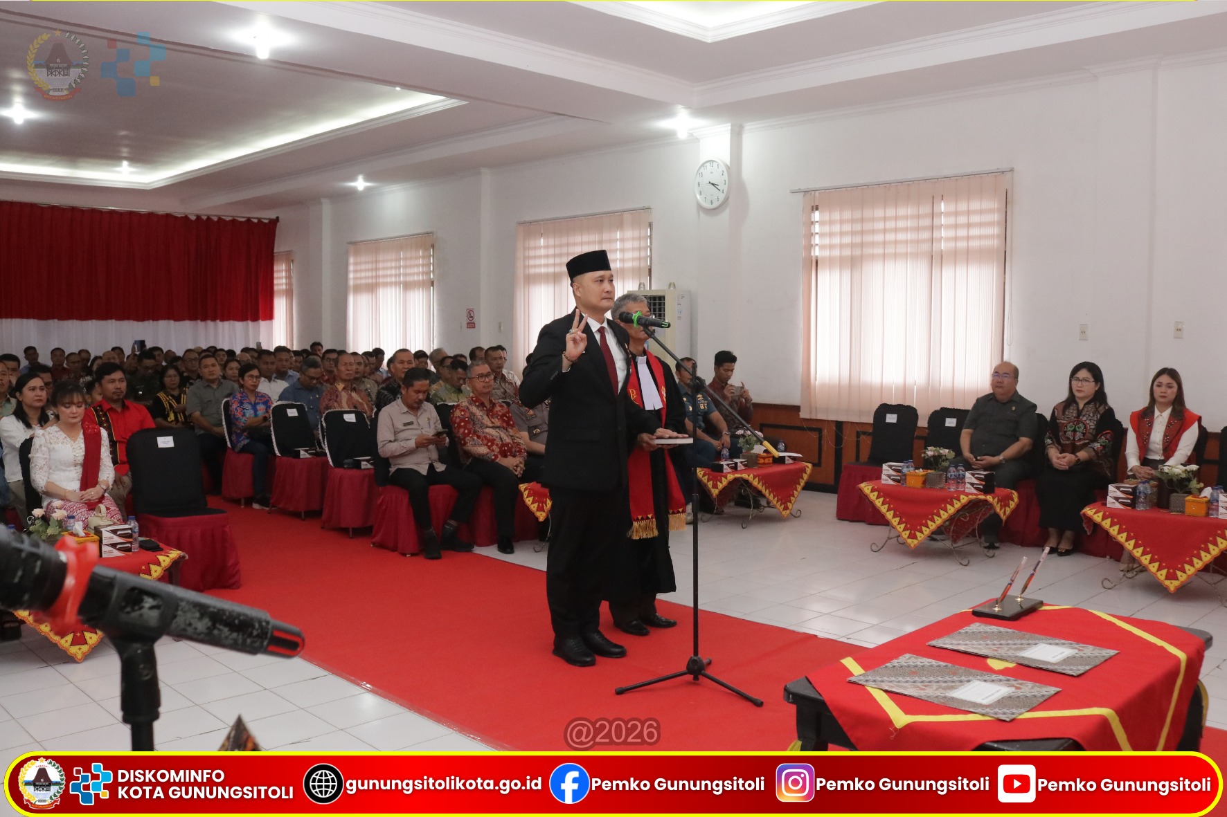 Gunungsitoli (30/01/2026) Wali Kota Gunungsitoli, Sowa’a Laoli, S.E., M.Si., melantik dan mengambil sumpah/janji jabatan Sekretaris Daerah Kota Gunungsitoli Andhika P. Laoly, SSTP., M.Si., CGCAE yang dirangkaikan dengan acara serah terima jabatan, bertempat di Ruang Rapat II Kantor Wali Kota Gunungsitoli, Jumat (30/1/26).
