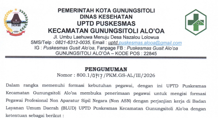 BeritaDinas Kesehatan PENGUMUMAN FORMASI PEGAWAI PROFESIONAL NON APARATUR SIPIL NEGARA (NON ASN) DENGAN PERJANJIAN KERJA DI BADAN LAYANAN UMUM DAERAH (BLUD) UPTD PUSKESMAS KECAMATAN GUNUNGSITOLI ALO’OA By Dinas Komunikasi dan Informatika - March 3, 2026 56 0 FacebookTwitterWhatsAppPinterestTelegramPrint PENGUMUMAN PENERIMAAN PEGAWAI BLUD PKM ALO’OADownload RELATED ARTICLESMORE FROM AUTHOR Berita PENGUMUMAN FORMASI PEGAWAI PROFESIONAL NON APARATUR SIPIL NEGARA (NON ASN) DENGAN PERJANJIAN KERJA DI BADAN LAYANAN UMUM DAERAH (BLUD) UPTD PUSKESMAS KECAMATAN GUNUNGSITOLI Berita PENGUMUMAN FORMASI PEGAWAI PROFESIONAL NON APARATUR SIPIL NEGARA (NON ASN) DENGAN PERJANJIAN KERJA DI BADAN LAYANAN UMUM DAERAH (BLUD) UPTD PUSKESMAS KECAMATAN GUNUNGSITOLI UTARA Berita PENGUMUMAN FORMASI PEGAWAI PROFESIONAL NON APARATUR SIPIL NEGARA (NON ASN) DENGAN PERJANJIAN KERJA DI BADAN LAYANAN UMUM DAERAH (BLUD) UPTD PUSKESMAS KECAMATAN GUNUNGSITOLI IDANOI LEAVE A REPLY Cancel reply Please enter your comment! Please enter your name here You have entered an incorrect email address! Please enter your email address here Save my name, email, and website in this browser for the next time I comment. Δ
