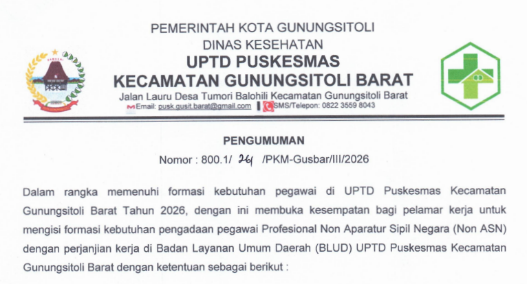 BeritaDinas Kesehatan PENGUMUMAN FORMASI PEGAWAI PROFESIONAL NON APARATUR SIPIL NEGARA (NON ASN) DENGAN PERJANJIAN KERJA DI BADAN LAYANAN UMUM DAERAH (BLUD) UPTD PUSKESMAS KECAMATAN GUNUNGSITOLI BARAT By Dinas Komunikasi dan Informatika - March 3, 2026 53 0 FacebookTwitterWhatsAppPinterestTelegramPrint PENGUMUMAN PENERIMAAN BLUD PKM GUSBARDownload RELATED ARTICLESMORE FROM AUTHOR Berita PENGUMUMAN FORMASI PEGAWAI PROFESIONAL NON APARATUR SIPIL NEGARA (NON ASN) DENGAN PERJANJIAN KERJA DI BADAN LAYANAN UMUM DAERAH (BLUD) UPTD PUSKESMAS KECAMATAN GUNUNGSITOLI Berita PENGUMUMAN FORMASI PEGAWAI PROFESIONAL NON APARATUR SIPIL NEGARA (NON ASN) DENGAN PERJANJIAN KERJA DI BADAN LAYANAN UMUM DAERAH (BLUD) UPTD PUSKESMAS KECAMATAN GUNUNGSITOLI UTARA Berita PENGUMUMAN FORMASI PEGAWAI PROFESIONAL NON APARATUR SIPIL NEGARA (NON ASN) DENGAN PERJANJIAN KERJA DI BADAN LAYANAN UMUM DAERAH (BLUD) UPTD PUSKESMAS KECAMATAN GUNUNGSITOLI IDANOI LEAVE A REPLY Cancel reply Please enter your comment! Please enter your name here You have entered an incorrect email address! Please enter your email address here Save my name, email, and website in this browser for the next time I comment. Δ
