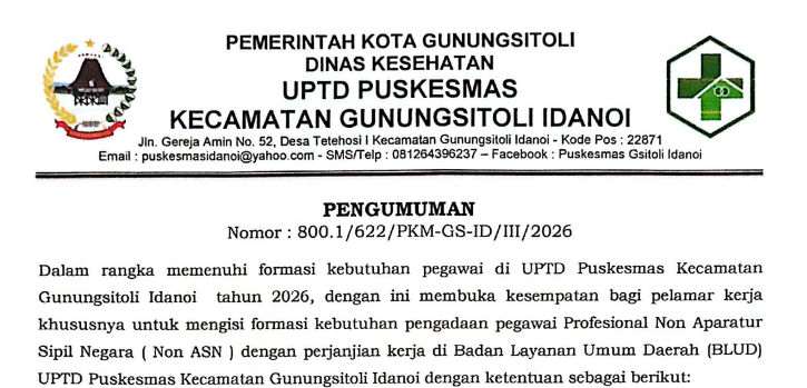 BeritaDinas Kesehatan PENGUMUMAN FORMASI PEGAWAI PROFESIONAL NON APARATUR SIPIL NEGARA (NON ASN) DENGAN PERJANJIAN KERJA DI BADAN LAYANAN UMUM DAERAH (BLUD) UPTD PUSKESMAS KECAMATAN GUNUNGSITOLI IDANOI By Dinas Komunikasi dan Informatika - March 3, 2026 81 0 FacebookTwitterWhatsAppPinterestTelegramPrint BLUD PKM IDANOIDownload RELATED ARTICLESMORE FROM AUTHOR Berita PENGUMUMAN FORMASI PEGAWAI PROFESIONAL NON APARATUR SIPIL NEGARA (NON ASN) DENGAN PERJANJIAN KERJA DI BADAN LAYANAN UMUM DAERAH (BLUD) UPTD PUSKESMAS KECAMATAN GUNUNGSITOLI Berita PENGUMUMAN FORMASI PEGAWAI PROFESIONAL NON APARATUR SIPIL NEGARA (NON ASN) DENGAN PERJANJIAN KERJA DI BADAN LAYANAN UMUM DAERAH (BLUD) UPTD PUSKESMAS KECAMATAN GUNUNGSITOLI UTARA Berita PENGUMUMAN FORMASI PEGAWAI PROFESIONAL NON APARATUR SIPIL NEGARA (NON ASN) DENGAN PERJANJIAN KERJA DI BADAN LAYANAN UMUM DAERAH (BLUD) UPTD PUSKESMAS KECAMATAN GUNUNGSITOLI ALO’OA LEAVE A REPLY Cancel reply Please enter your comment! Please enter your name here You have entered an incorrect email address! Please enter your email address here Save my name, email, and website in this browser for the next time I comment. Δ