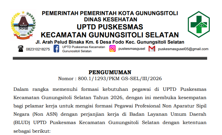 BeritaDinas Kesehatan PENGUMUMAN FORMASI PEGAWAI PROFESIONAL NON APARATUR SIPIL NEGARA (NON ASN) DENGAN PERJANJIAN KERJA DI BADAN LAYANAN UMUM DAERAH (BLUD) UPTD PUSKESMAS KECAMATAN GUNUNGSITOLI SELATAN By Dinas Komunikasi dan Informatika - March 3, 2026 201 0 FacebookTwitterWhatsAppPinterestTelegramPrint PENGUMUMAN PEGAWAI BLUD PKM GUSELDownload RELATED ARTICLESMORE FROM AUTHOR Berita PENGUMUMAN FORMASI PEGAWAI PROFESIONAL NON APARATUR SIPIL NEGARA (NON ASN) DENGAN PERJANJIAN KERJA DI BADAN LAYANAN UMUM DAERAH (BLUD) UPTD PUSKESMAS KECAMATAN GUNUNGSITOLI Berita PENGUMUMAN FORMASI PEGAWAI PROFESIONAL NON APARATUR SIPIL NEGARA (NON ASN) DENGAN PERJANJIAN KERJA DI BADAN LAYANAN UMUM DAERAH (BLUD) UPTD PUSKESMAS KECAMATAN GUNUNGSITOLI UTARA Berita PENGUMUMAN FORMASI PEGAWAI PROFESIONAL NON APARATUR SIPIL NEGARA (NON ASN) DENGAN PERJANJIAN KERJA DI BADAN LAYANAN UMUM DAERAH (BLUD) UPTD PUSKESMAS KECAMATAN GUNUNGSITOLI IDANOI LEAVE A REPLY Cancel reply Please enter your comment! Please enter your name here You have entered an incorrect email address! Please enter your email address here Save my name, email, and website in this browser for the next time I comment. Δ