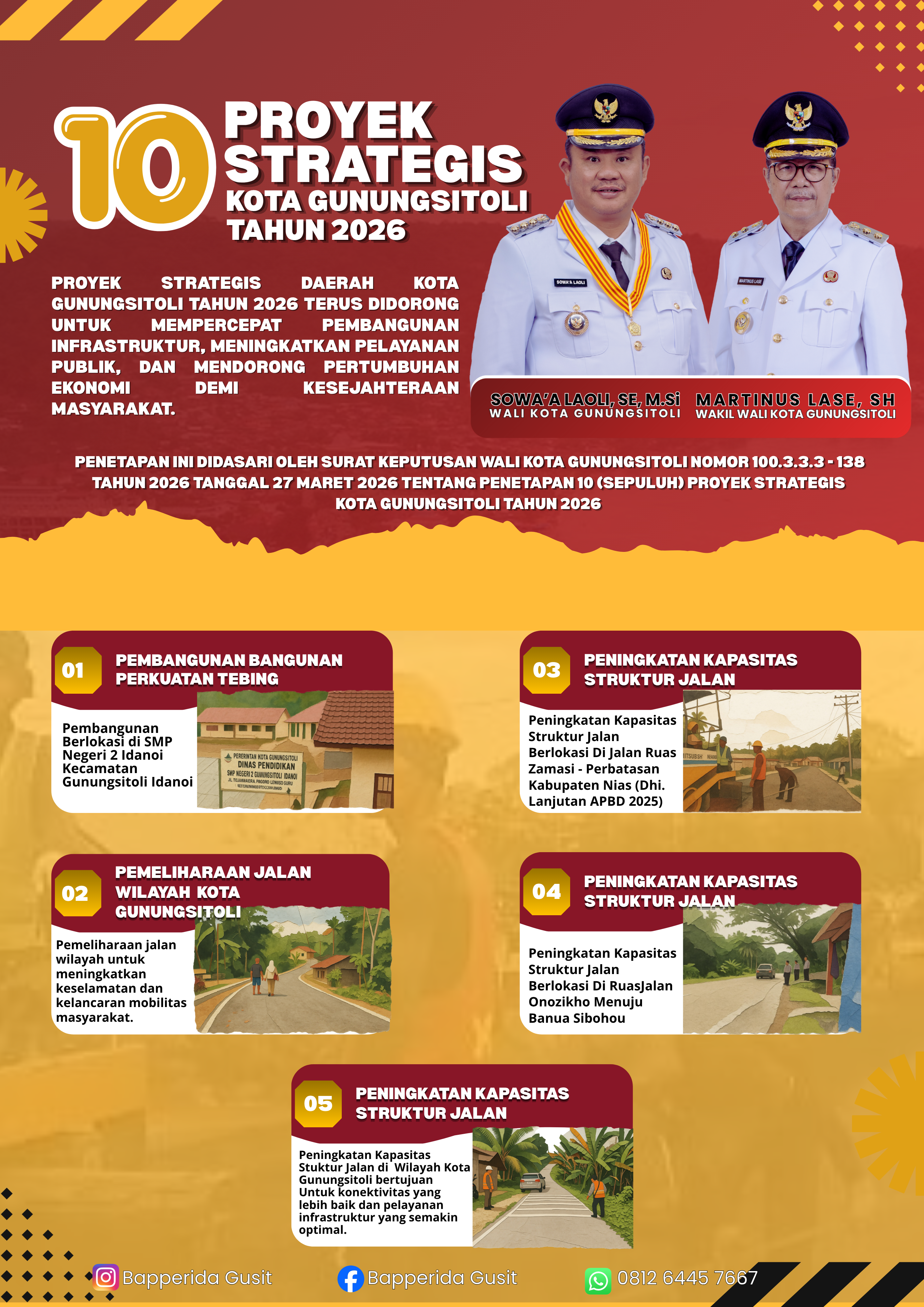 Penetapan Proyek Strategis Kota Gunungsitoli ini didasari adanya isu strategis daerah yang berdampak luas terhadap masyarakat dan perekonomian, serta sinkronisasi kebijakan daerah dengan kebijakan Nasional dan Provinsi. Adapun 10 (sepuluh) Proyek Strategis Kota Gunungsitoli sebagaimana tertuang dalam Surat Keputusan Wali Kota Gunungsitoli Nomor 100.3.3.3-138 Tahun 2026 tanggal 27 Maret 2026 tentang Penetapan 10(Sepuluh) Proyek Strategis Kota Gunungsitoli Tahun 2026 meliputi :