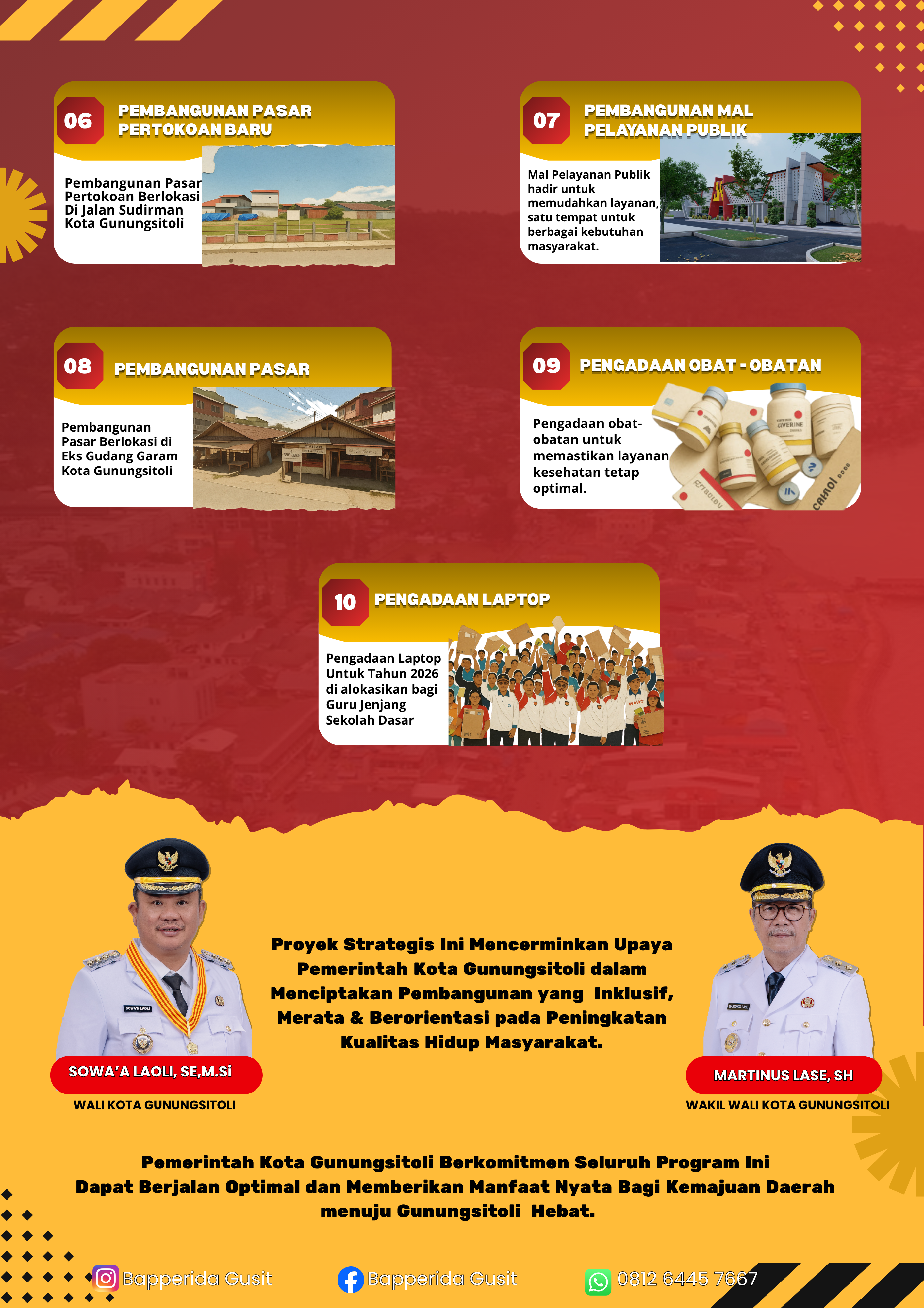 Secara keseluruhan, proyek-proyek strategis ini mencerminkan upaya Pemerintah Kota Gunungsitoli dalam menciptakan pembangunan yang inklusif, merata, dan berorientasi pada peningkatan kualitas hidup masyarakat. Dengan dukungan semua pihak, diharapkan seluruh program ini dapat berjalan optimal dan memberikan manfaat nyata bagi kemajuan daerah.