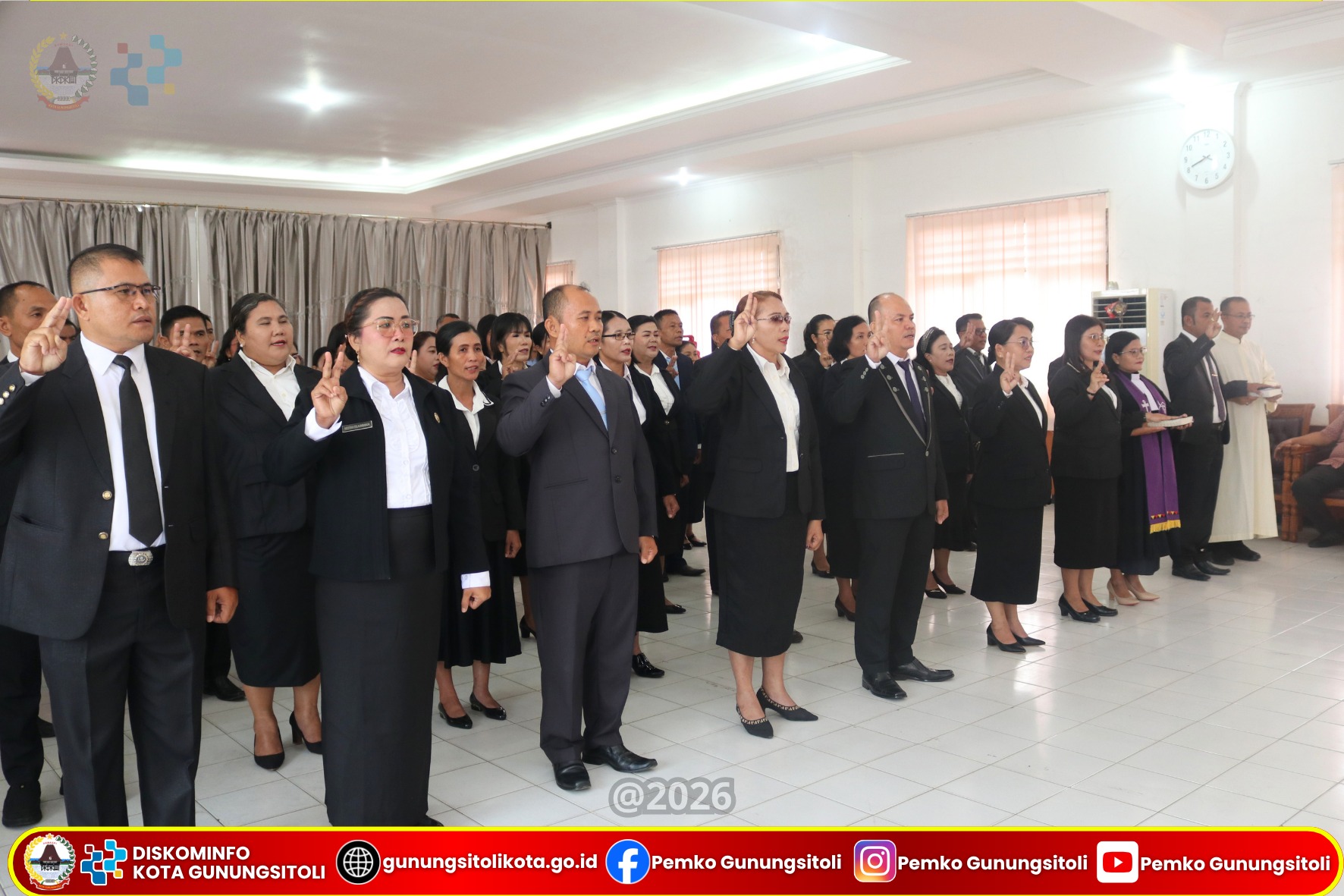 Gunungsitoli, 27 Maret 2026 – Wali Kota Gunungsitoli, Sowa’a Laoli, S.E., M.Si., didampingi Wakil Wali Kota Gunungsitoli, Martinus Lase, S.H., secara resmi melantik dan mengambil sumpah/janji Kepala Sekolah serta Penjabat Pengawas, termasuk guru yang diangkat, dipindahkan, dan diberhentikan dalam tugas tambahan sebagai Kepala Sekolah di lingkungan Pemerintah Kota Gunungsitoli. Kegiatan berlangsung tertib dan khidmat di Ruang Rapat II Kantor Wali Kota Gunungsitoli, Jumat (27/03/2026).