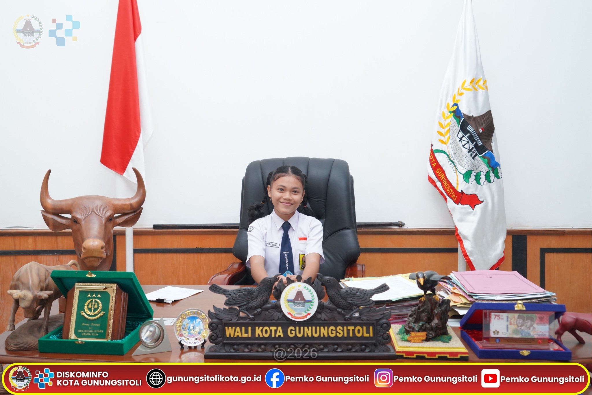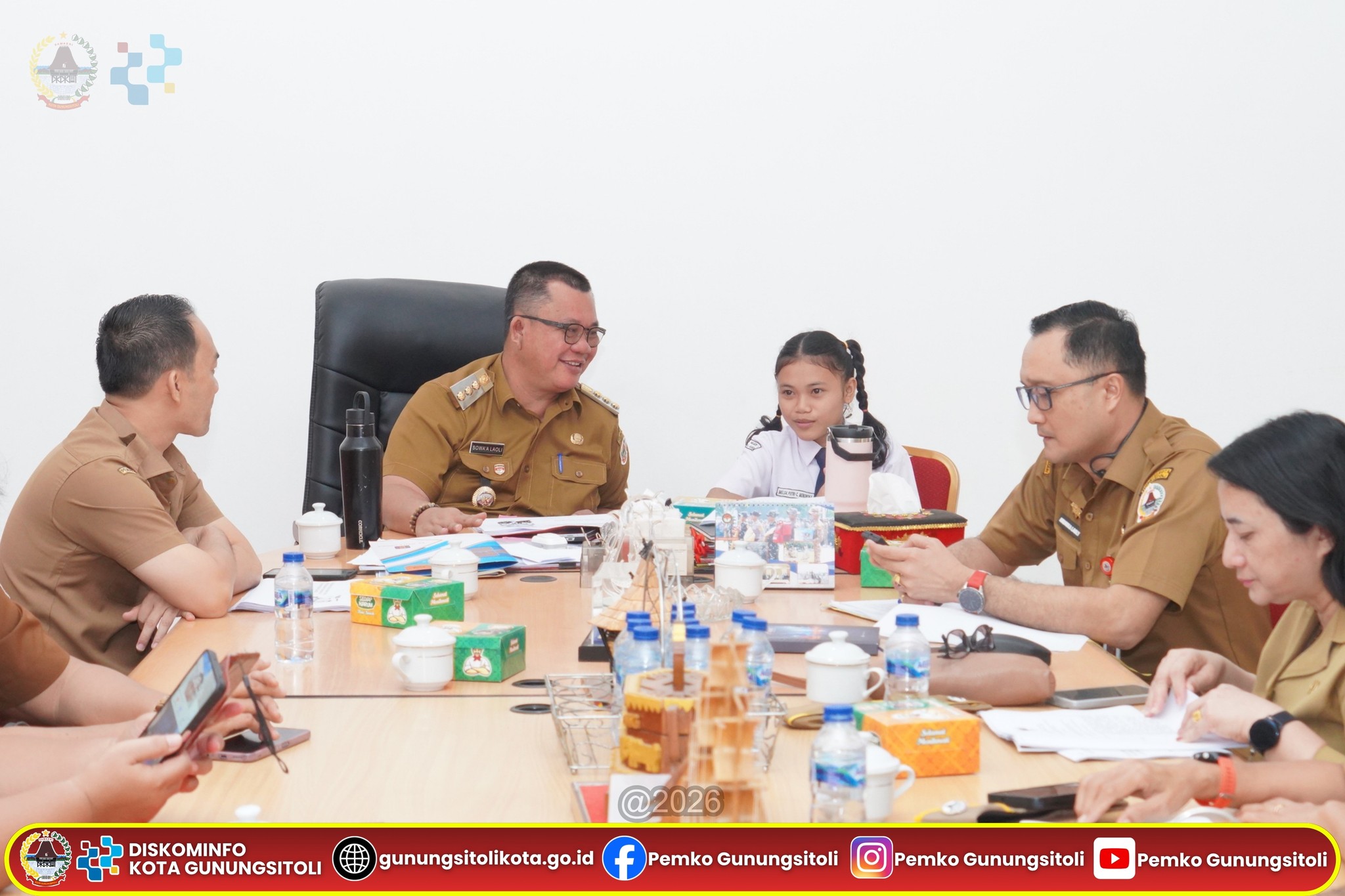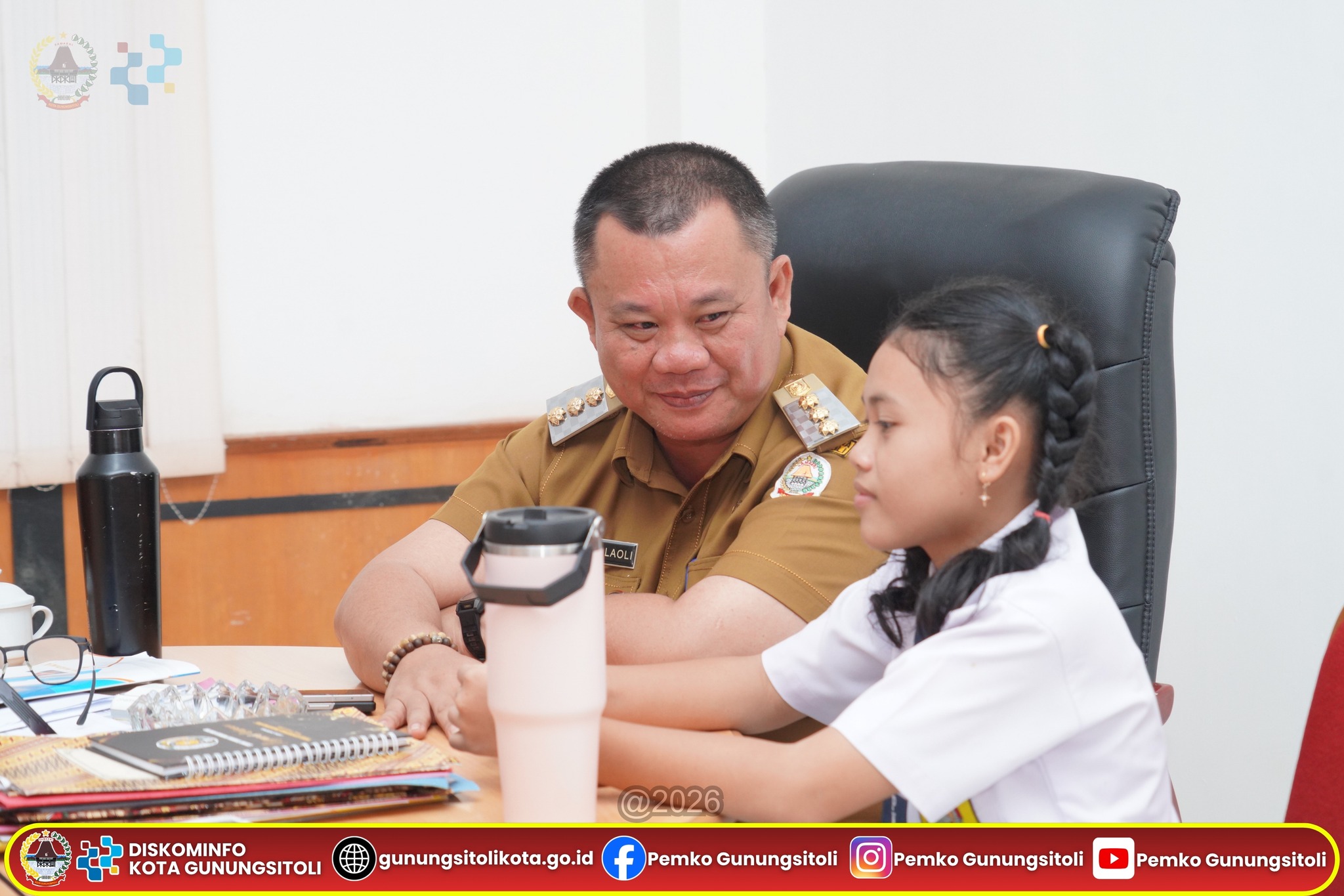 Gunungsitoli, 20 April 2026 — Ada suasana berbeda di Ruang Kerja Wali Kota Gunungsitoli, Senin (20/4/2026). Di tengah rapat koordinasi strategis bersama sejumlah Organisasi Perangkat Daerah (OPD), Wali Kota Gunungsitoli, Sowa’a Laoli, S.E., M.Si., didampingi Sekretaris Daerah Kota Gunungsitoli, Andhika Perdana Laoly, S.STP., M.Si., CGCAE., menghadirkan sosok muda inspiratif yang mencuri perhatian: Imelda Putri Cahyani Mendröfa yang berhasil meraih Juara I Lomba Pidato “Sehari Menjadi Wali Kota” dalam rangka HUT ke-348 Kota Gunungsitoli.