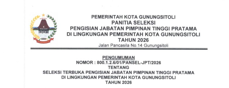 Berita & Siaran PersDokumen LainFoto PENGUMUMAN SELEKSI TERBUKA PENGISIAN JABATAN PIMPINAN TINGGI PRATAMA DILINGKUNGAN PEMERINTAH KOTA GUNUNGSITOLI TAHUN 2026 By Dinas Komunikasi dan Informatika - April 24, 2026 86 0 FacebookTwitterWhatsAppPinterestTelegramPrint PENGUMUMAN SELTER JPT KOTA GUNUNGSITOLI TA 2026_000062Download RELATED ARTICLESMORE FROM AUTHOR Berita Wali Kota Gunungsitoli Resmi Buka MUSDA IV MUI, Tegaskan Peran Strategis Ulama dan Semangat Kolaborasi Berita Meriahkan Hari Jadi Ke-348 Kota Gunungsitoli, Fashion Carnaval dan Ragam Seni Budaya Tampil Memukau Berita Lansia Tangguh dan Mandiri, Wali Kota Gunungsitoli Pimpin Wisuda Sekolah Lansia se-Kota Gunungsitoli LEAVE A REPLY Cancel reply Please enter your comment! Please enter your name here You have entered an incorrect email address! Please enter your email address here Save my name, email, and website in this browser for the next time I comment. Δ