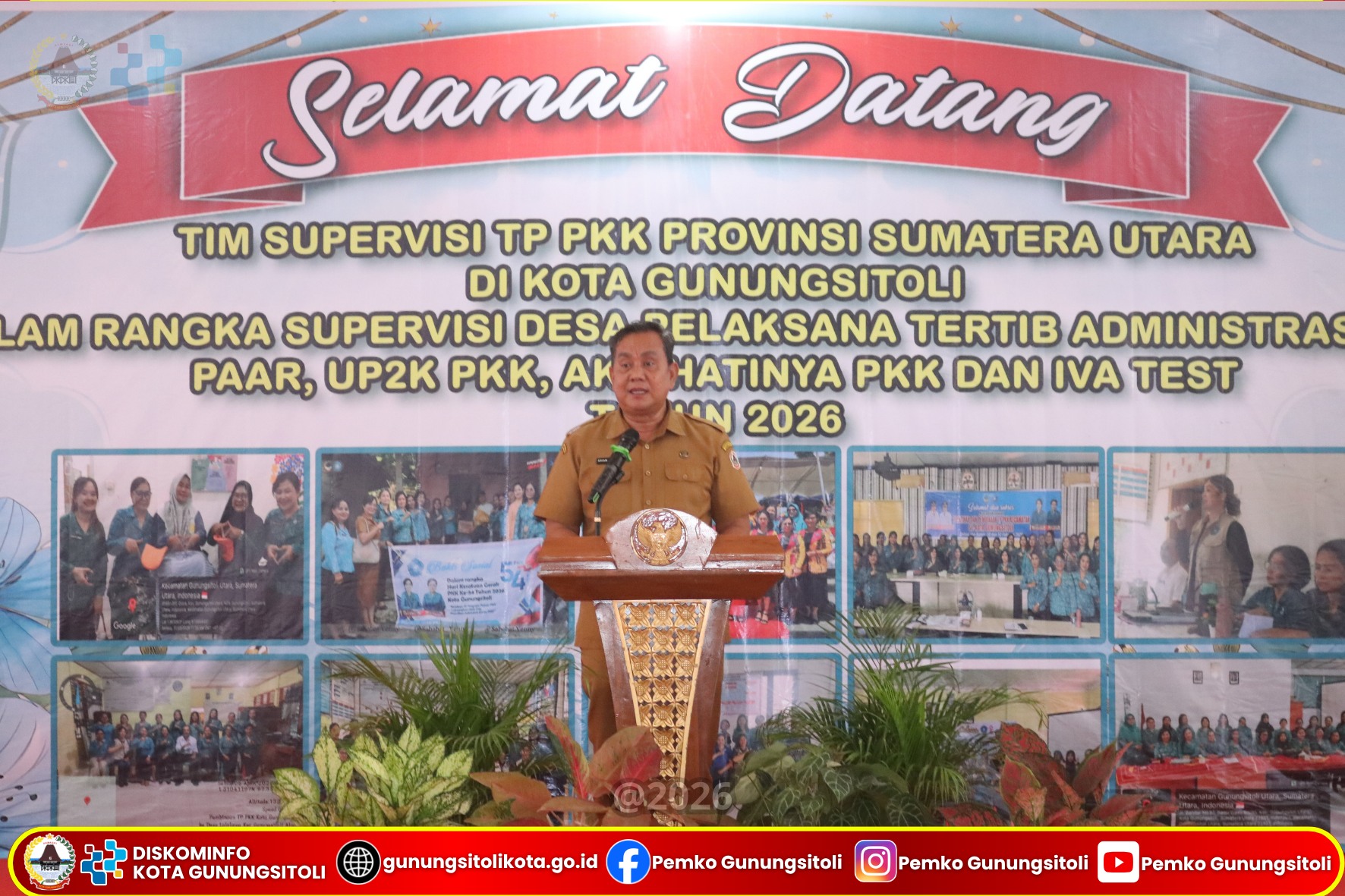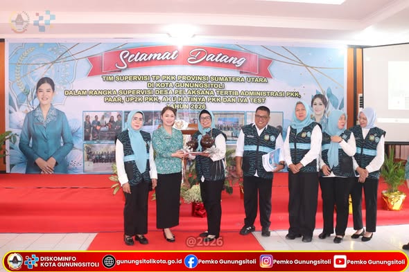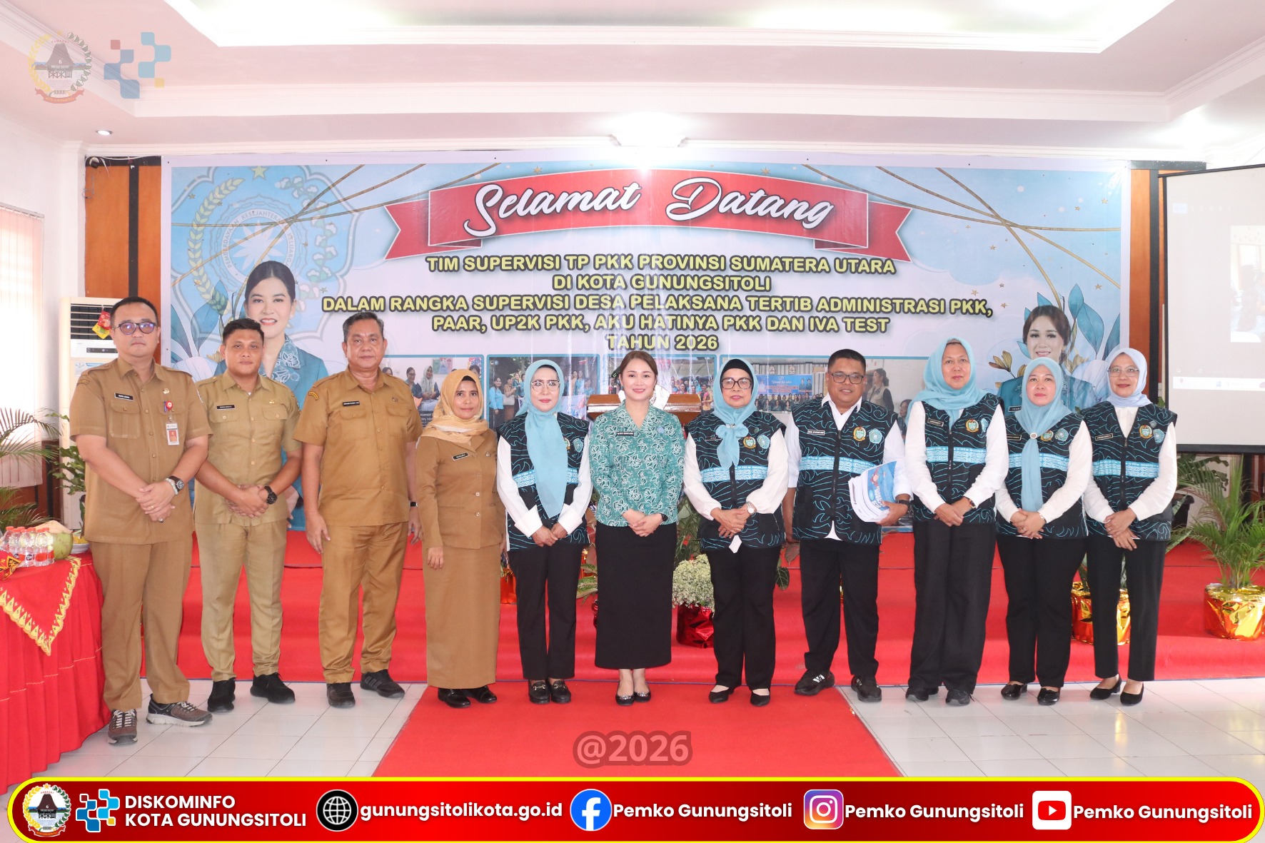 Gunungsitoli, 13 April 2026 – Ketua Tim Penggerak PKK Kota Gunungsitoli, Ny. Veny Sowa’a Laoli, menyambut kedatangan Tim Supervisi TP PKK Provinsi Sumatera Utara dalam rangka pelaksanaan Supervisi Desa/Kelurahan Pelaksana Tertib Administrasi PKK, PAAR, UP2K PKK, Aku Hatinya PKK, dan IVA Test Tahun 2026 di Kota Gunungsitoli. Kegiatan supervisi dilaksanakan di Ruang Rapat II Kantor Wali Kota Gunungsitoli pada Senin (13/04/2026).