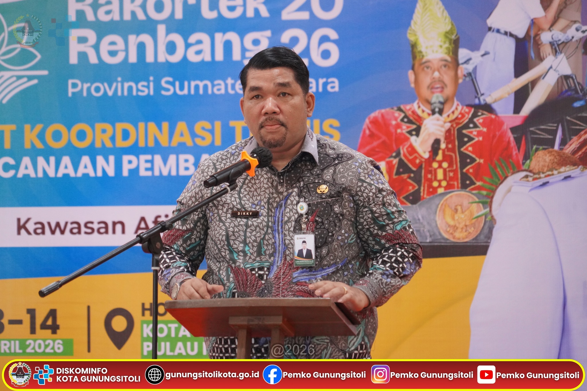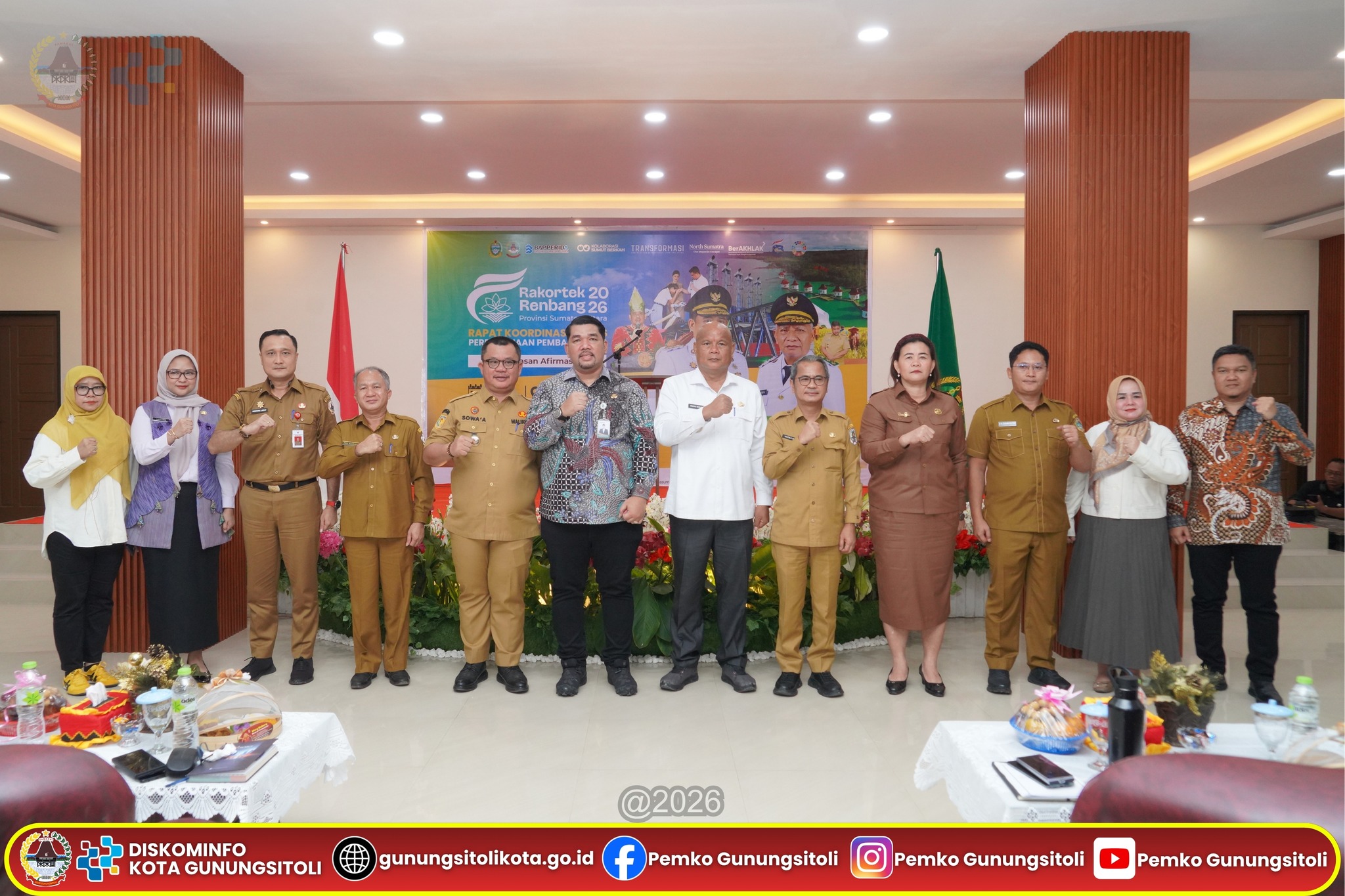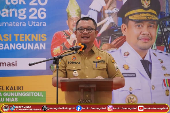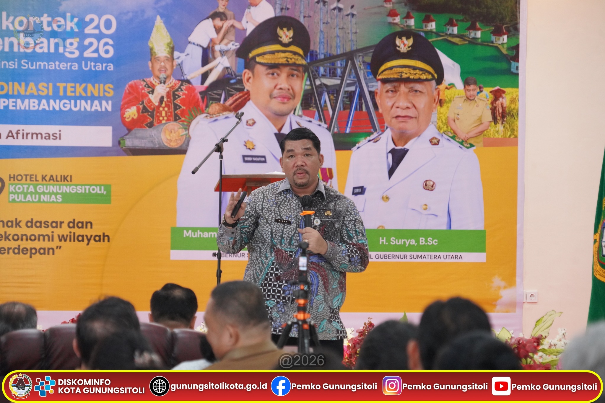 Gunungsitoli, 13 April 2026 — Wali Kota Gunungsitoli, Sowa’a Laoli, S.E., M.Si., didampingi Sekretaris Daerah Kota Gunungsitoli, menghadiri Pembukaan Rapat Koordinasi Teknis Perencanaan Pembangunan (Rakortekrenbang) se-Sumatera Utara Tahun 2026 untuk Kawasan Afirmasi, yang diselenggarakan oleh Pemerintah Provinsi Sumatera Utara melalui Badan Perencanaan Pembangunan, Riset dan Inovasi Daerah Provinsi Sumatera Utara. Kegiatan ini berlangsung di Hotel Kaliki, Kota Gunungsitoli, Senin (13/4/2026).