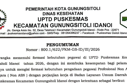 PENGUMUMAN FORMASI PEGAWAI PROFESIONAL NON APARATUR SIPIL NEGARA (NON ASN) DENGAN PERJANJIAN KERJA DI BADAN LAYANAN UMUM DAERAH (BLUD) UPTD PUSKESMAS KECAMATAN GUNUNGSITOLI IDANOI