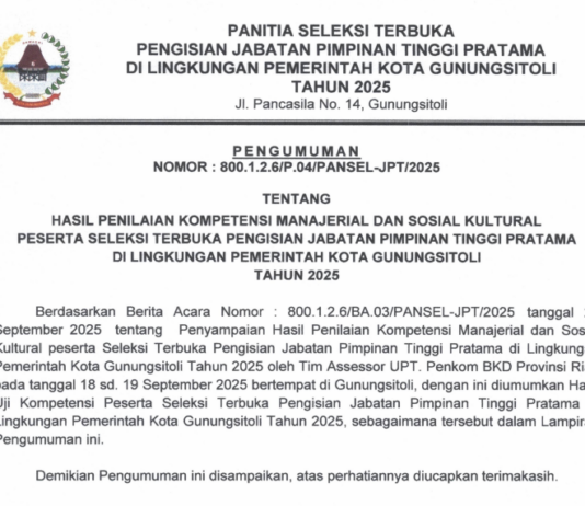 Pengumuman Hasil Penilaian Kompetensi Manajerial dan Sosial Kultural Peserta Seleksi Terbuka Pengisian JPTP Lingkup Pemko Gunungsitoli Tahun 2025