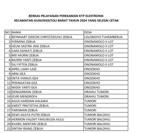 BERKAS PELAYANAN PEREKAMAN KTP ELEKTRONIK KECAMATAN GUNUNGSITOLI BARAT YANG SELESAI CETAK